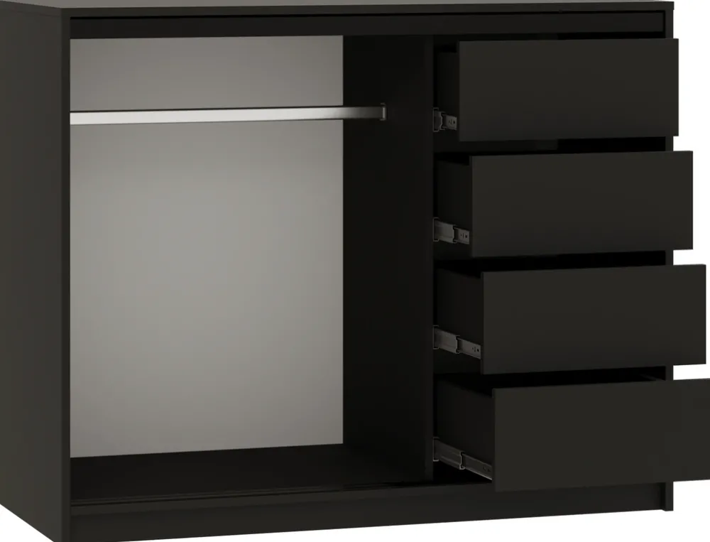 - Komoda przesuwna LOFT charakteryzuje się pojemnym wnętrzem, które składa się z aluminiowego drążka na wieszaki oraz czterech pojemnych szuflad na bieliznę i akcesoria. Drzwi komody poruszają się na stalowym systemie przesuwnym w czarnym kolorze.