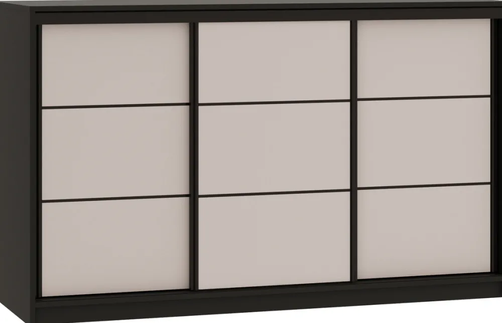 Loftowa komoda przesuwna LOFT o szerokości 160 cm to propozycja dla miłośników industrialnego designu i praktycznych rozwiązań. Trzy drzwi osadzone na solidnym metalowym systemie przesuwnym w czarnym kolorze dodają meblowi charakteru i nowoczesnego wyglądu, jednocześnie zapewniając łatwy dostęp do wnętrza