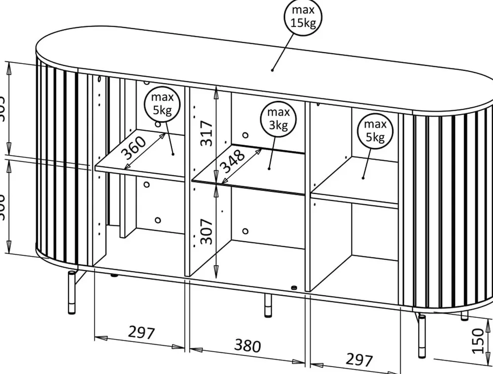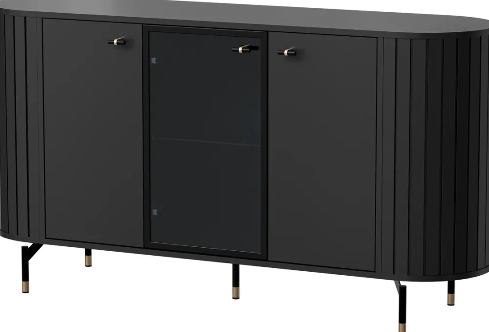 - Komoda do salonu 150 cm ZELDA charakteryzuje się zaokrąglonymi boczkami wykonanymi z płyty MDF, które doskonale wpisują się we współczesne aranżacje pomieszczeń. Komoda z witryną stoi na metalowych nóżkach o wysokości 15 cm.