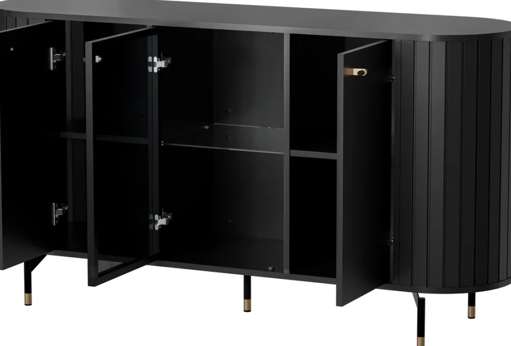 Po bokach komody umieszczono drzwi z systemem cichego domyku, które nie tylko podnoszą komfort użytkowania, ale i podkreślają wysoką jakość wykonania mebla. Za drzwiami znajdują się dwie pojemne półki, które doskonale sprawdzą się w przechowywaniu książek, dokumentów lub innych niezbędnych akcesoriów, pomagając w utrzymaniu porządku.