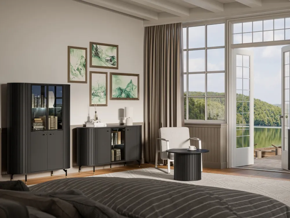 Nowoczesna komoda do salonu ZELDA łączy w sobie elegancję i funkcjonalność, doskonale komponując się w każdej aranżacji wnętrza. Wyjątkowy design z zaokrąglonymi boczkami wykonanymi z płyty MDF nadaje jej przytulny i ponadczasowy wygląd, a wykończenia obrzeży okleiną ABS zapewniają trwałość i estetyczny wygląd przez długie lata użytkowania.