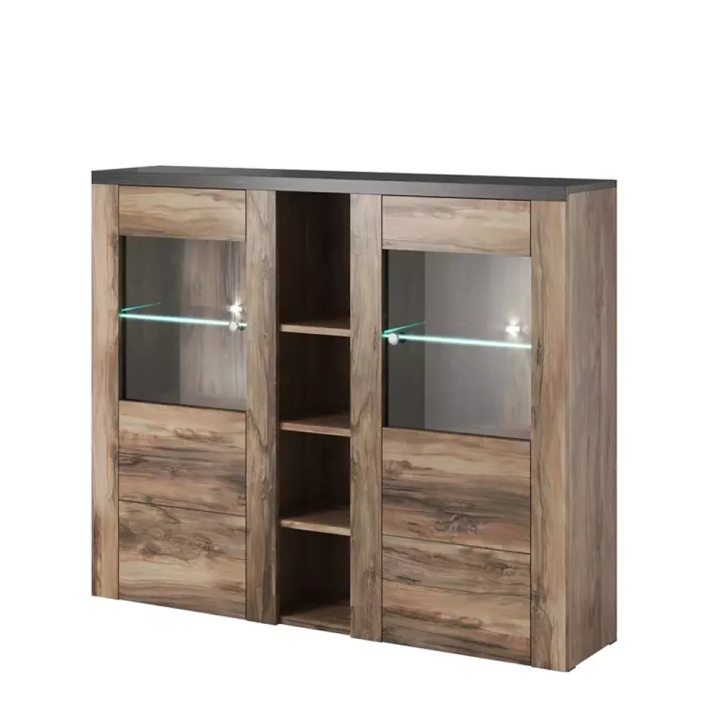 Elegancki barek o szerokości 155 cm wyposażony w oszklone drzwiczki uchylne, za którymi znajdują się półki oraz otwarte półki pośrodku.