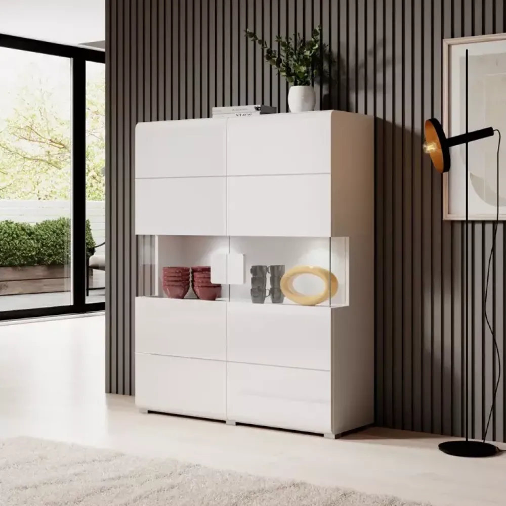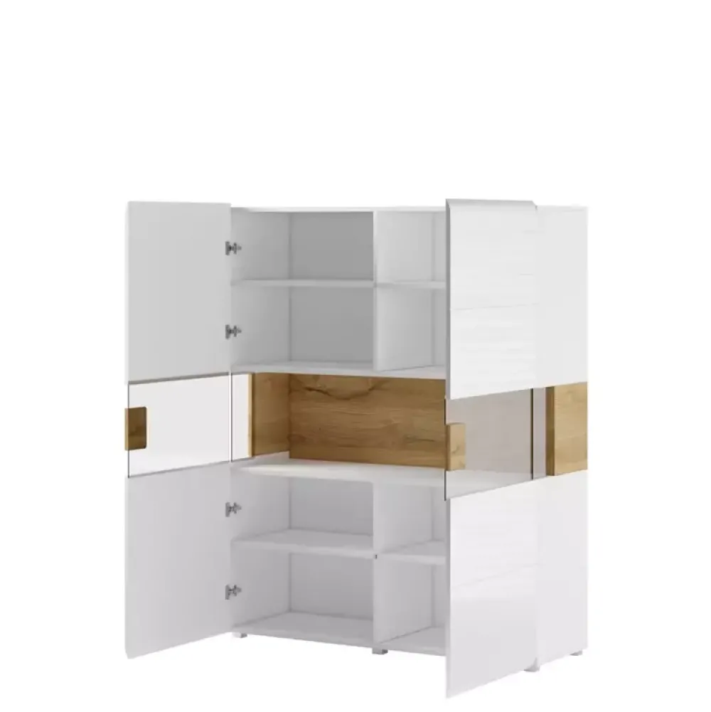 - Komoda o szerokości 122 cm z oszklonymi drzwiczkami uchylnymi.