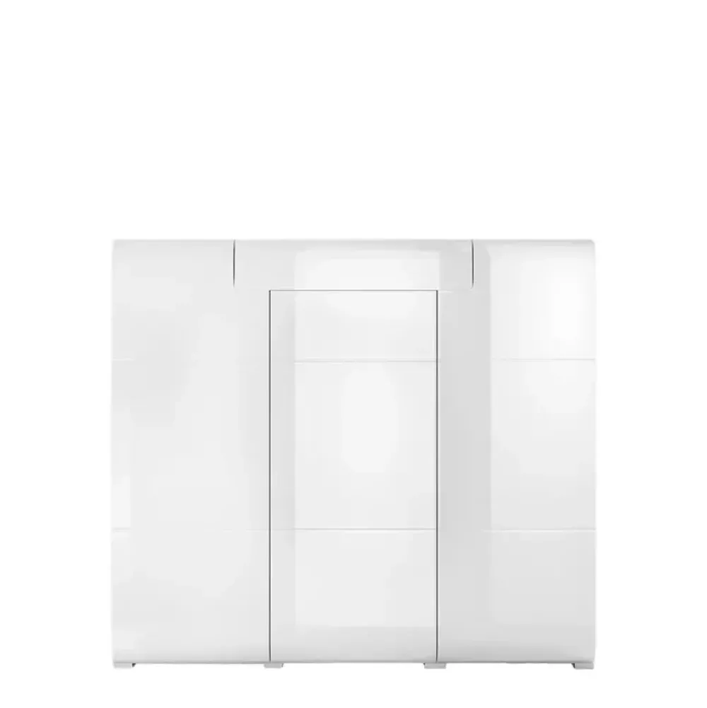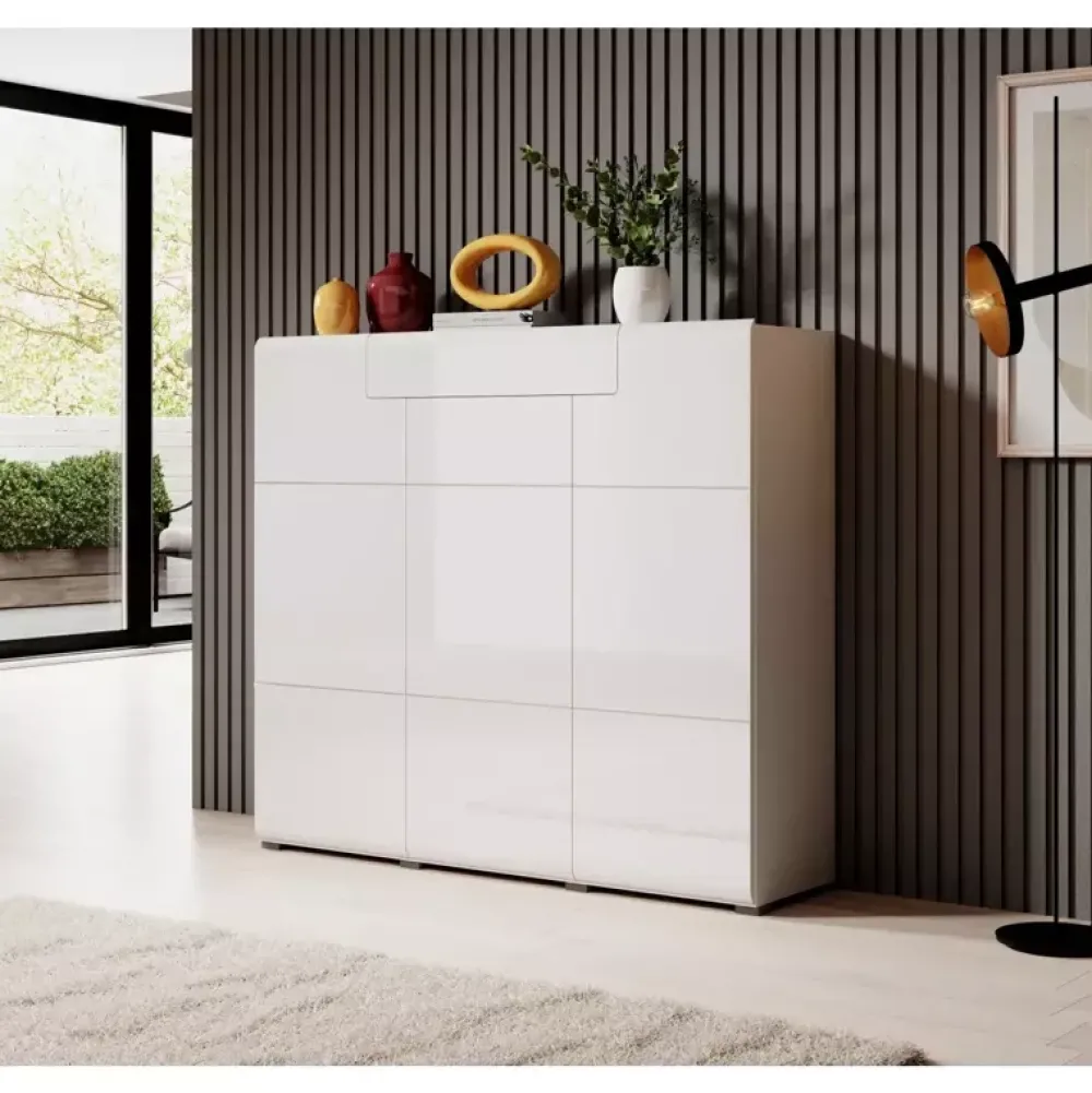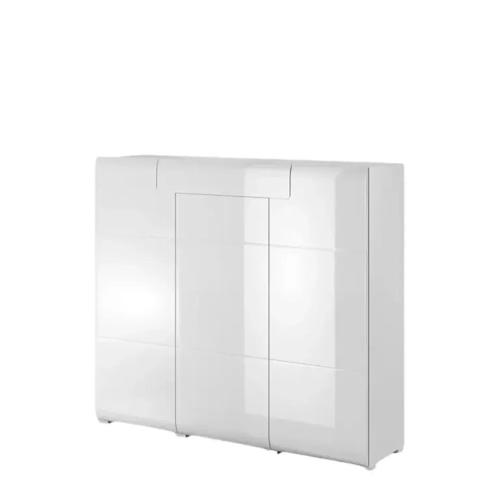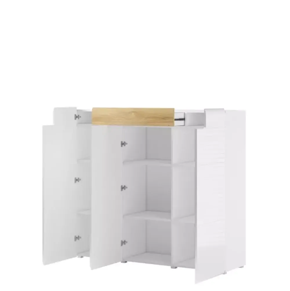 Pojemna komoda o szerokości 147 cm z trzema parami drzwiczek uchylnych oraz jedną szufladą.