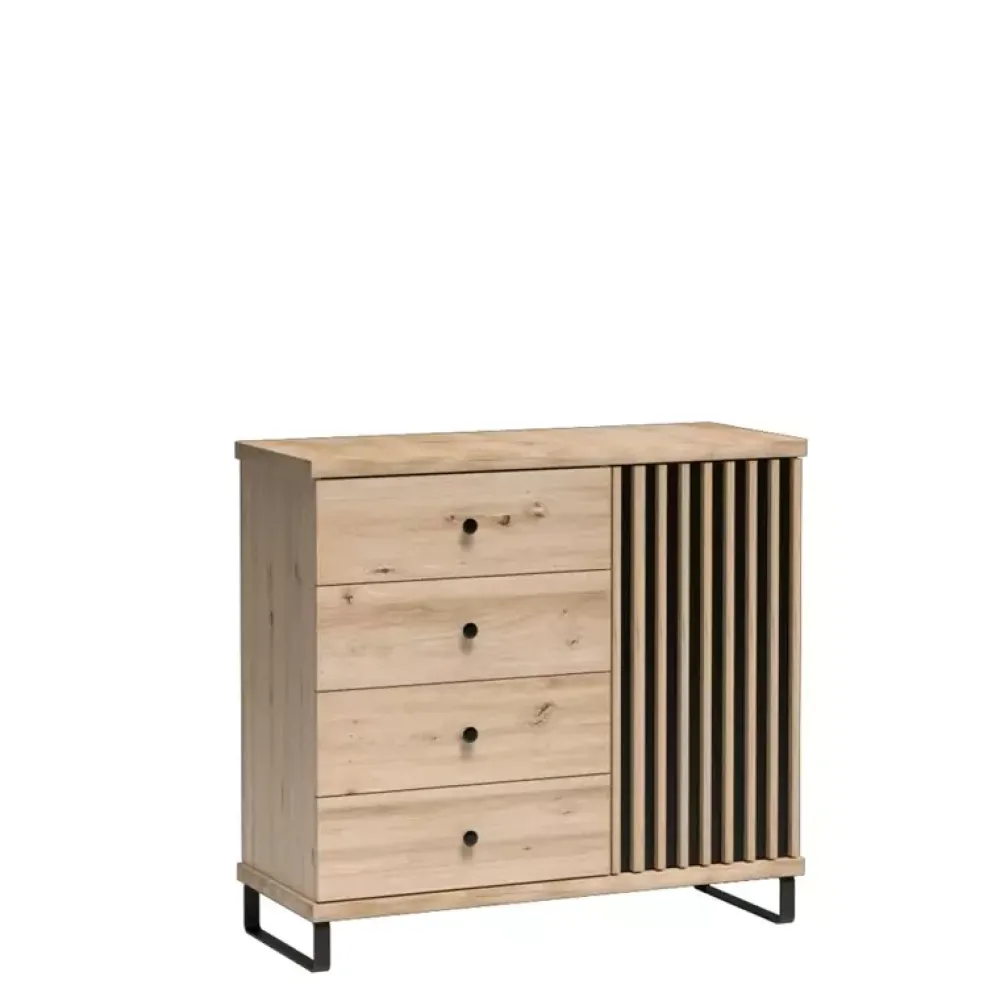Komoda CALIS jest propozycją, która dzięki swojej stylistyce doskonale sprawdza się zarówno w sypialniach, jak i współczesnych aranżacjach salonów. Cztery pojemne szuflady oraz półka, która znajduje się za drzwiami wykonanymi w formie lameli to gwarancja dużej ilości miejsca mimo niewielkich rozmiarów.