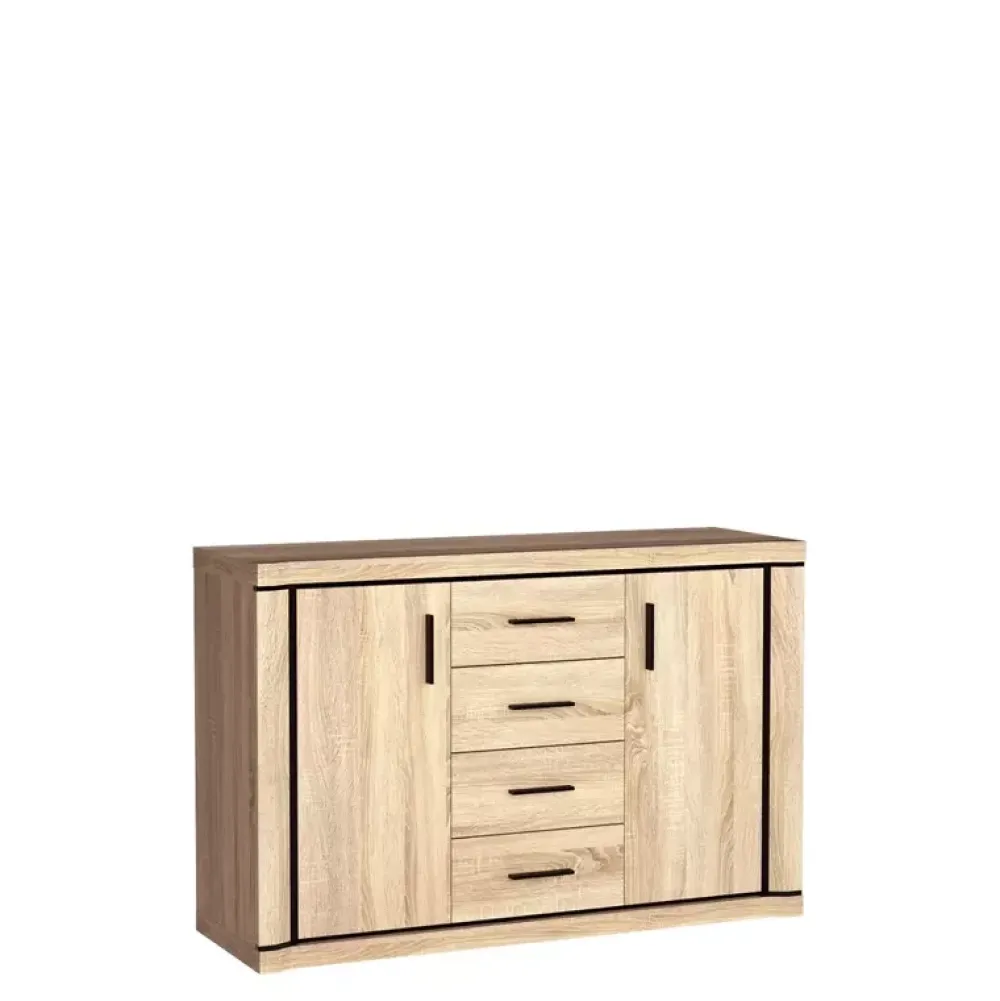 Komoda DENEA to bardzo pojemna propozycja, która pozwoli ci przechować niezbędne akcesoria oraz część garderoby. Została wyposażona w szafkę po lewej oraz prawej stronie, w każdej z nich znajduje się półka. Dodatkowo w centralnej części komody swoje miejsce znalazły cztery pojemne szuflady.