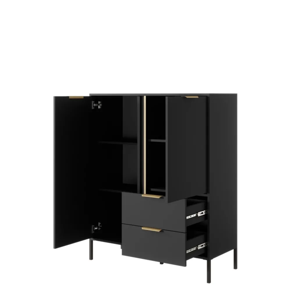 Nowoczesna komoda stoi na pięciu wytrzymałych metalowych nóżkach w kolorze czarnym, które nadają jej nie tylko stabilności, ale także wytwornej lekkości.