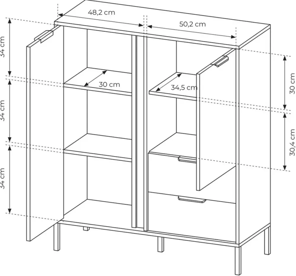 Ta stylowa komoda posiada aż pięć wygodnych półek, oferując mnóstwo miejsca na książki, dekoracje czy kolekcje. Dodatkowo wyposażona jest w dwie przestronne szuflady, które pomieszczą wszystkie niezbędne drobiazgi. Szuflady wyposażone są w kulkowe prowadnice, co umożliwia łatwy i całkowity wysuw, zapewniając pełen dostęp do ich wnętrza.