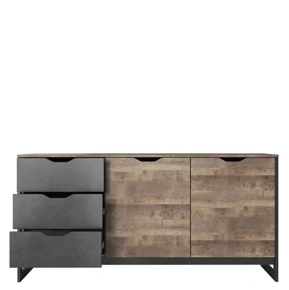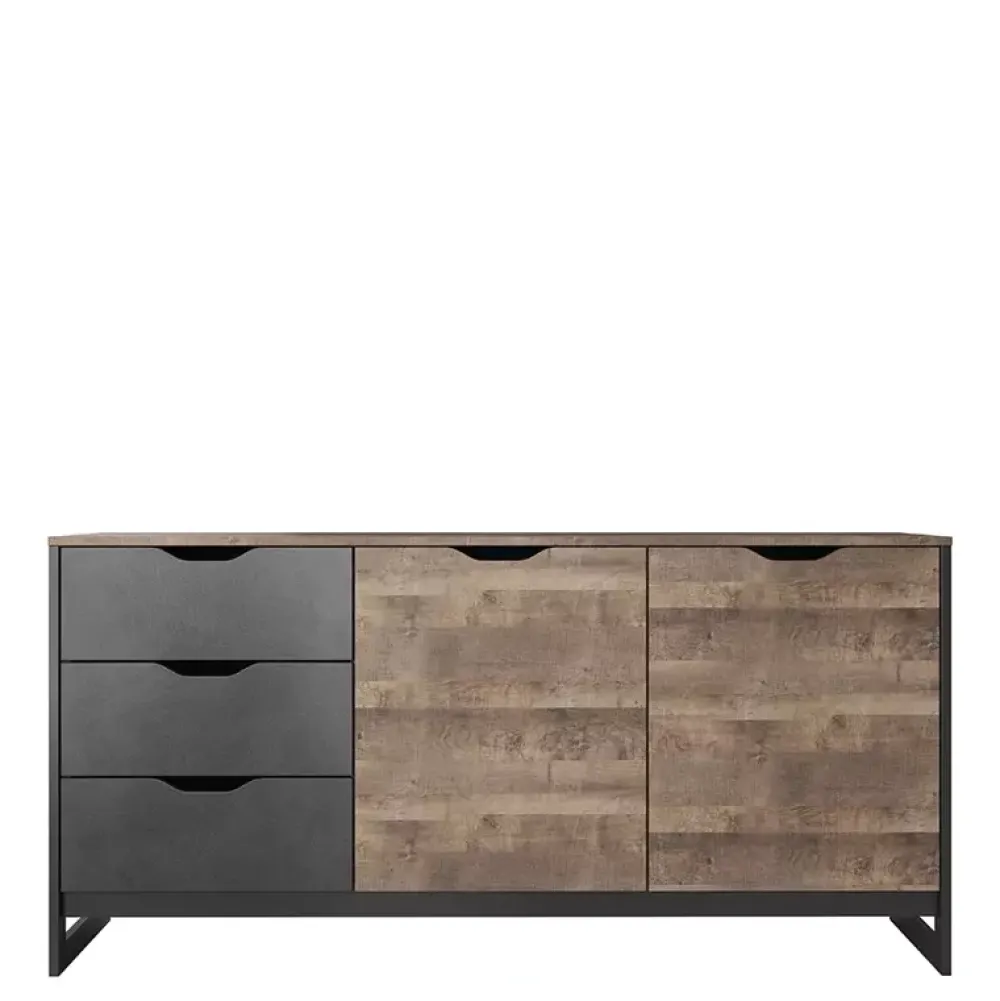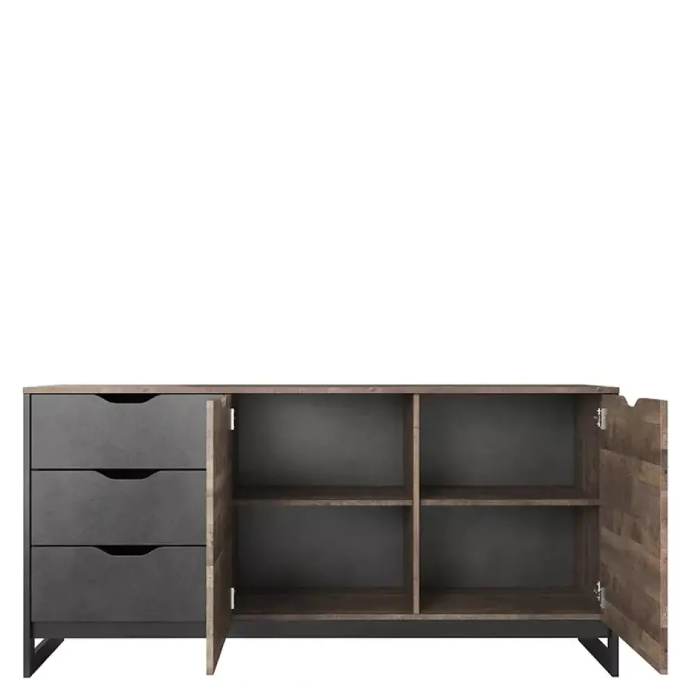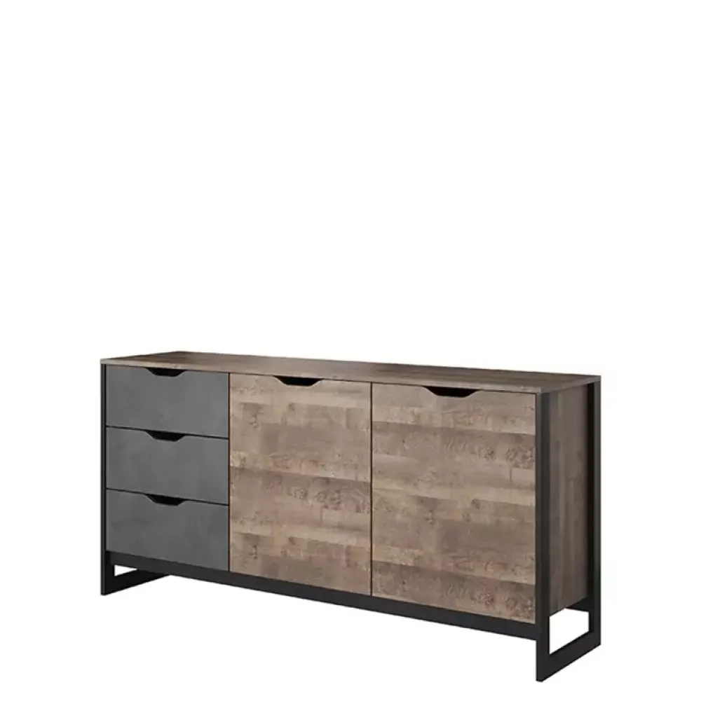 - Komoda do salonu urządzanego w stylu loftowym, industrialnym lub nowoczesnym. Komoda ma 161 cm szerokości i posiada trzy szuflady oraz dwie półki oddzielone od siebie w pionie.