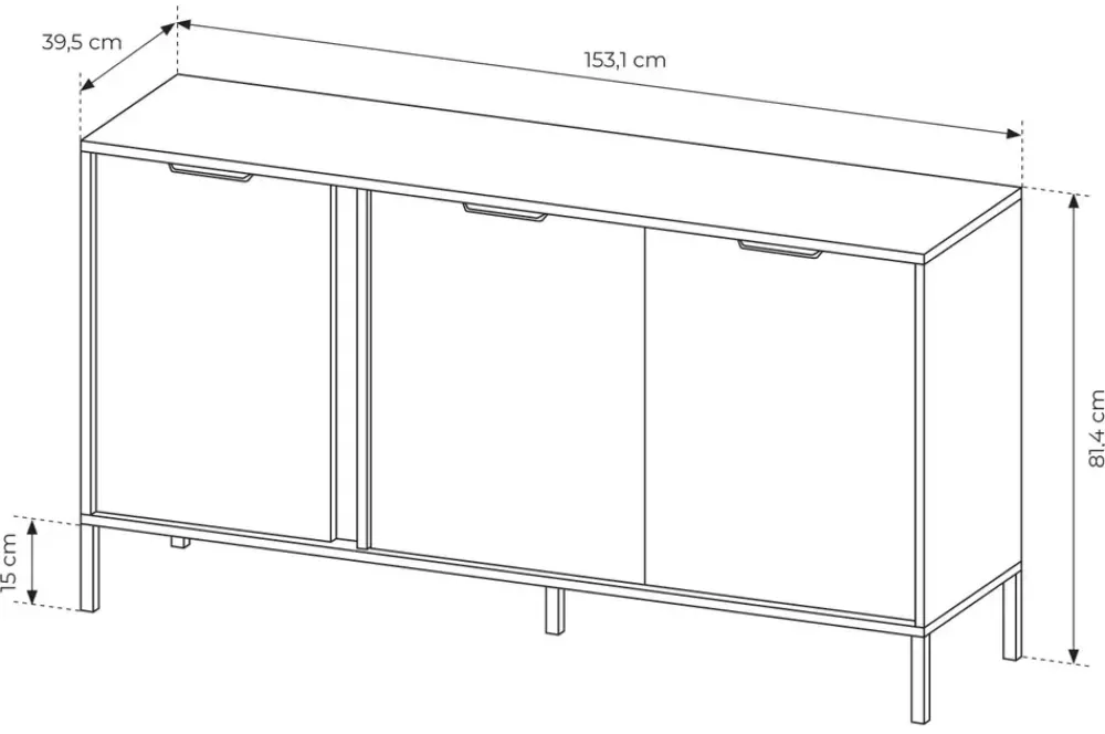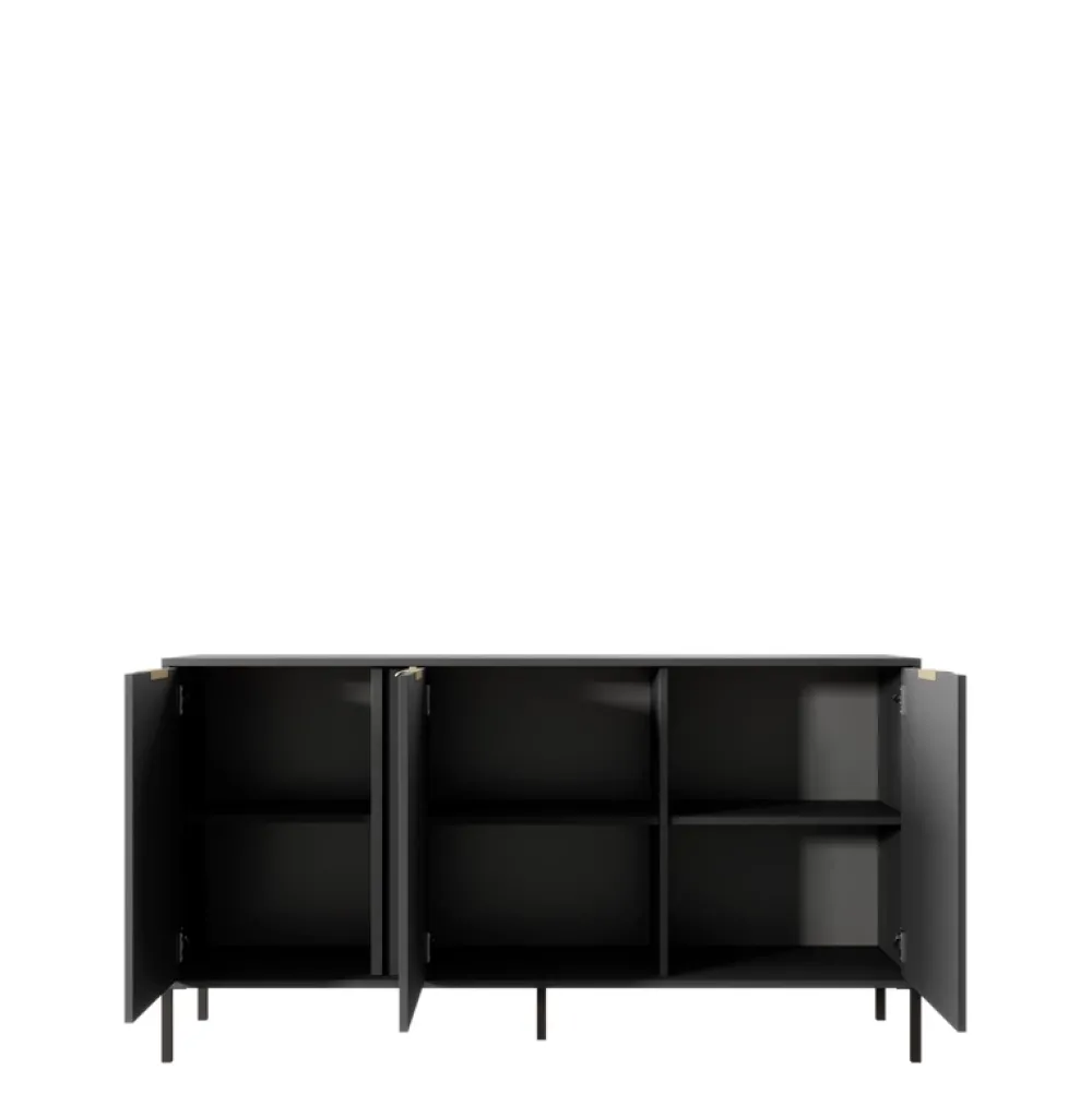 Komoda ta posiada trzy duże drzwi, które kryją w sobie trzy praktyczne półki, oferując mnóstwo miejsca na przechowywanie ulubionych książek, dekoracji czy innych przedmiotów. Wnętrze mebla zostało przemyślane tak, aby zapewnić maksymalną funkcjonalność i wygodę użytkowania.