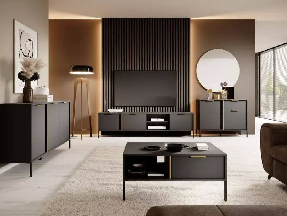 Zainwestuj w tę niezwykłą nowoczesną komodę do salonu, która zachwyci swoim designem oraz funkcjonalnością, tworząc wyjątkowe wnętrze pełne stylu i klasy.