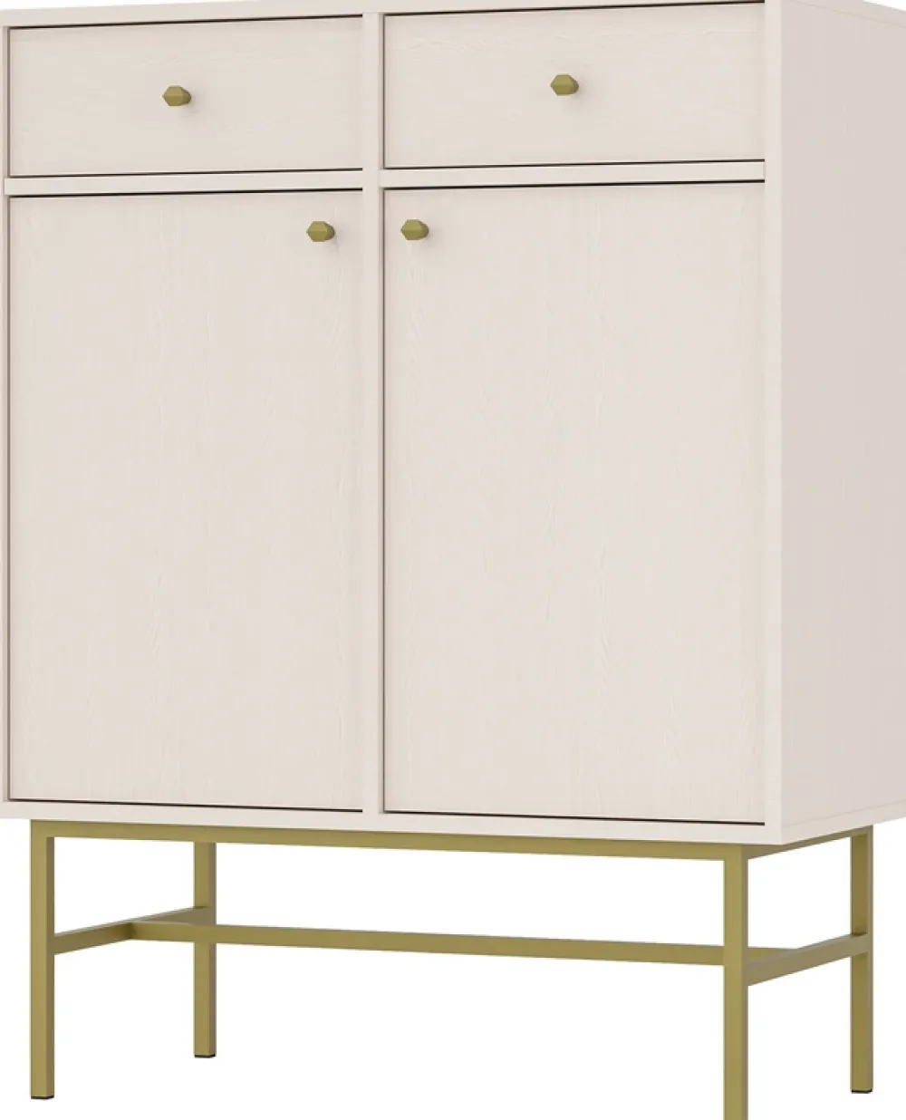 Stabilność i elegancja to cechy wyróżniające tę komodę. Nóżki w formie metalowego stelaża o wysokości 27,5 cm nie tylko dodają jej lekkości, ale także zapewniają trwałość i stabilność. Metalowe uchwyty podkreślają nowoczesny charakter mebla i ułatwiają dostęp do przechowywanych przedmiotów.