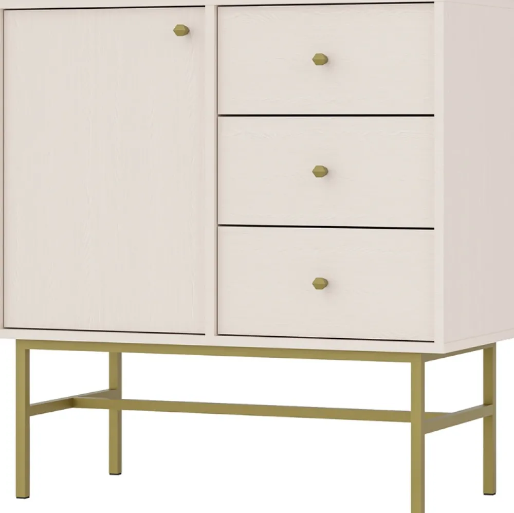 - Komoda do salonu 84 cm TOKEN posiada drzwi po lewej stronie a za nimi półkę. Po prawej stronie komody znajdują się trzy szuflady osadzone na prowadnicach kulkowych. Nóżki oraz uchwyty komody wykonano z metalu w czarnym kolorze.