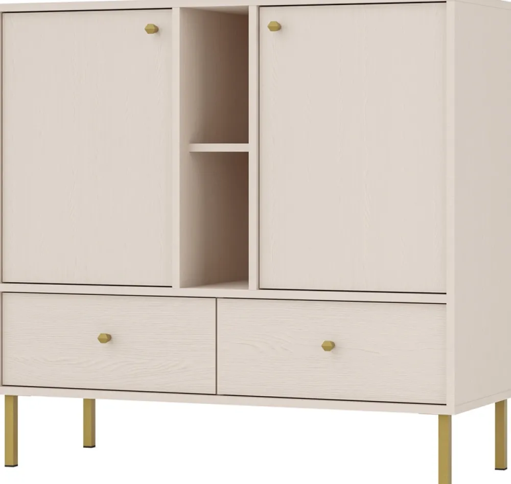 Między drzwiami umieszczona jest otwarta przegroda, która zawiera dwie funkcjonalne półki. To miejsce stworzone do wyeksponowania dekoracji, książek czy sprzętu RTV. Otwarta konstrukcja dodaje lekkości i nowoczesnego charakteru komodzie, sprawiając, że świetnie wkomponuje się w każdy styl wnętrza.