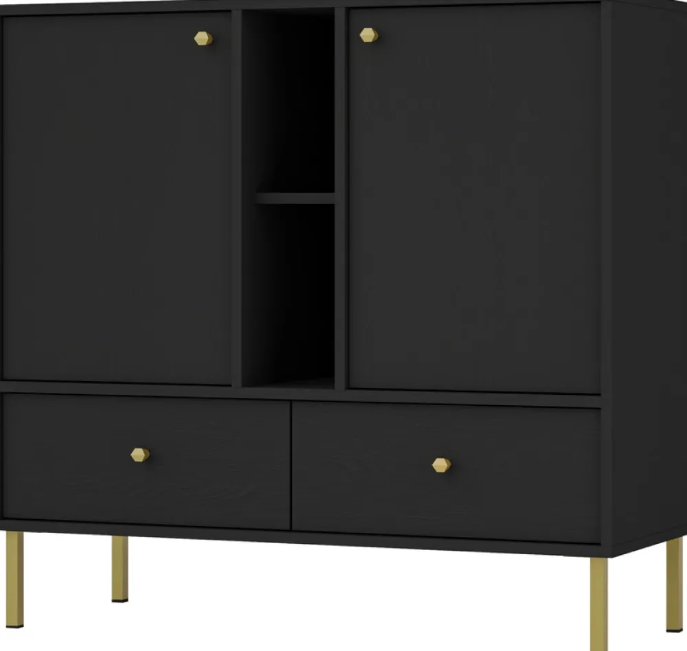 Między drzwiami umieszczona jest otwarta przegroda, która zawiera dwie funkcjonalne półki. To miejsce stworzone do wyeksponowania dekoracji, książek czy sprzętu RTV. Otwarta konstrukcja dodaje lekkości i nowoczesnego charakteru komodzie, sprawiając, że świetnie wkomponuje się w każdy styl wnętrza.