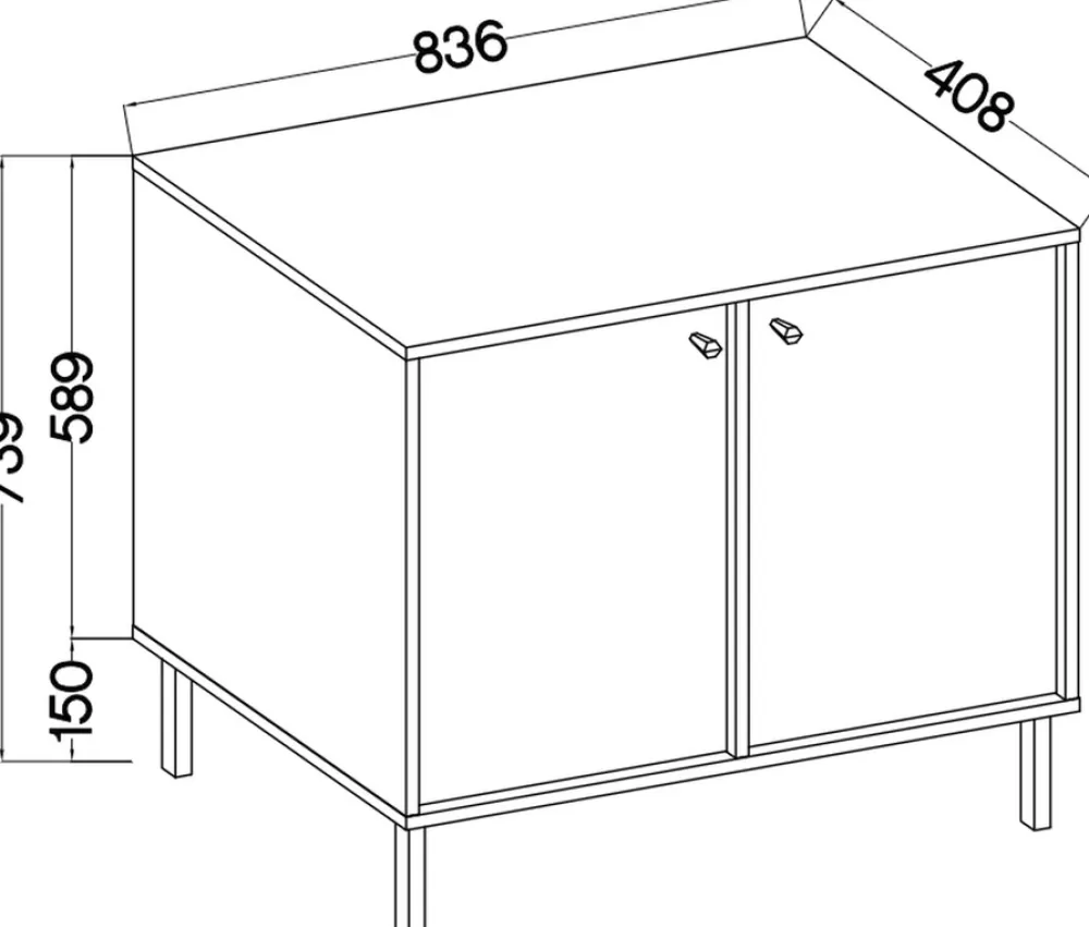 - Komoda do salonu 83,5 cm TOKEN posiada parę drzwi, za każdymi drzwiami znajduje się jedna półka. Komoda posiada metalowe uchwyty oraz nóżki o wysokości 15 cm, pod którymi mogą swobodnie pracować odkurzacze samojezdne.