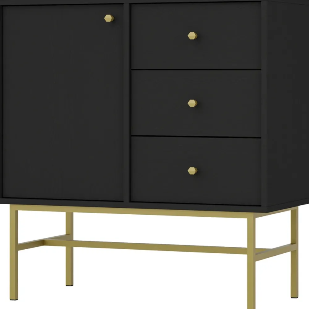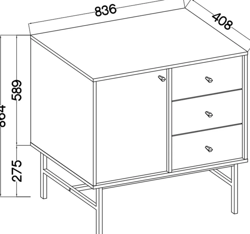 - Komoda do salonu 84 cm TOKEN posiada drzwi po lewej stronie a za nimi półkę. Po prawej stronie komody znajdują się trzy szuflady osadzone na prowadnicach kulkowych. Nóżki oraz uchwyty komody wykonano z metalu w czarnym kolorze.