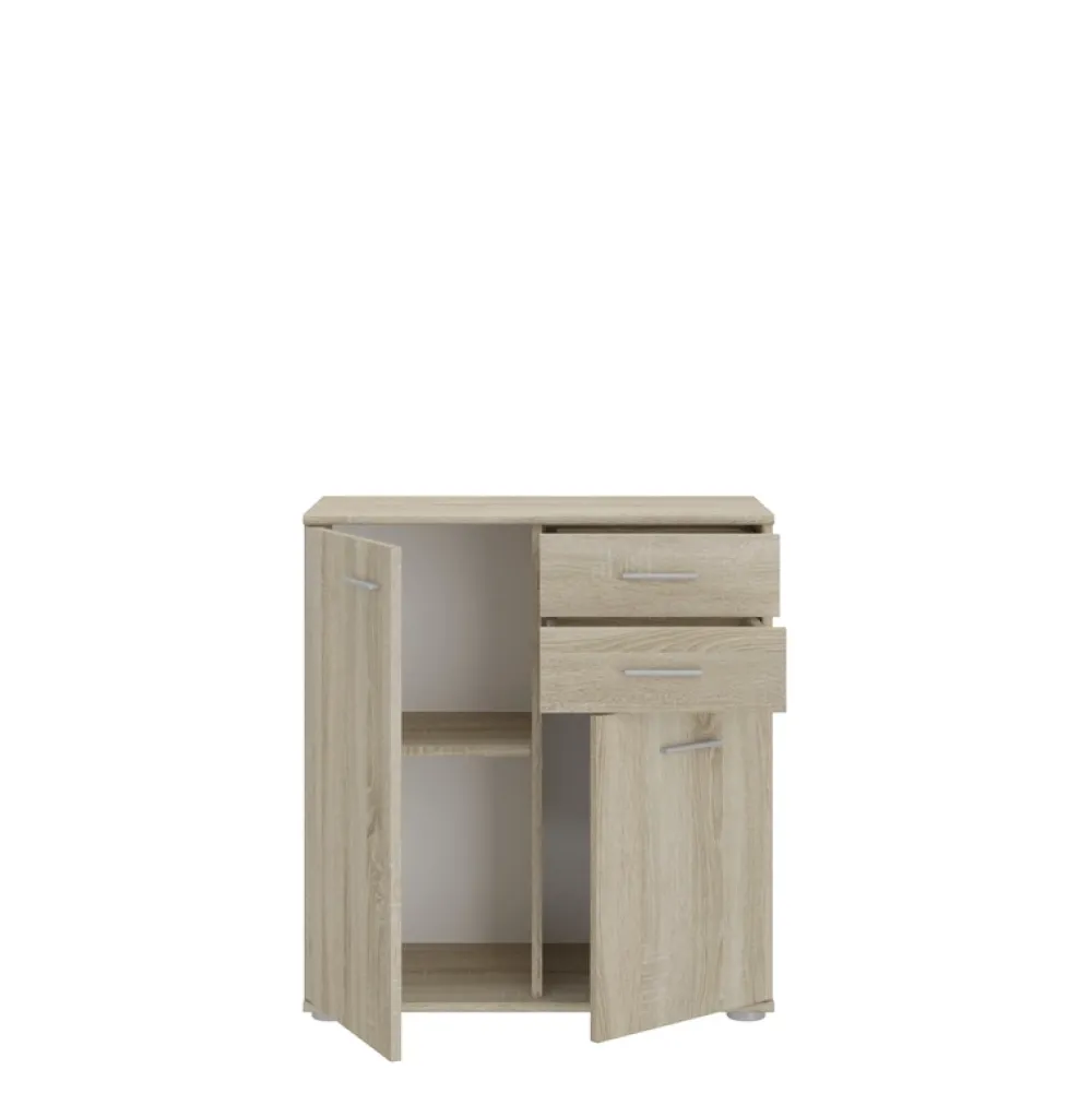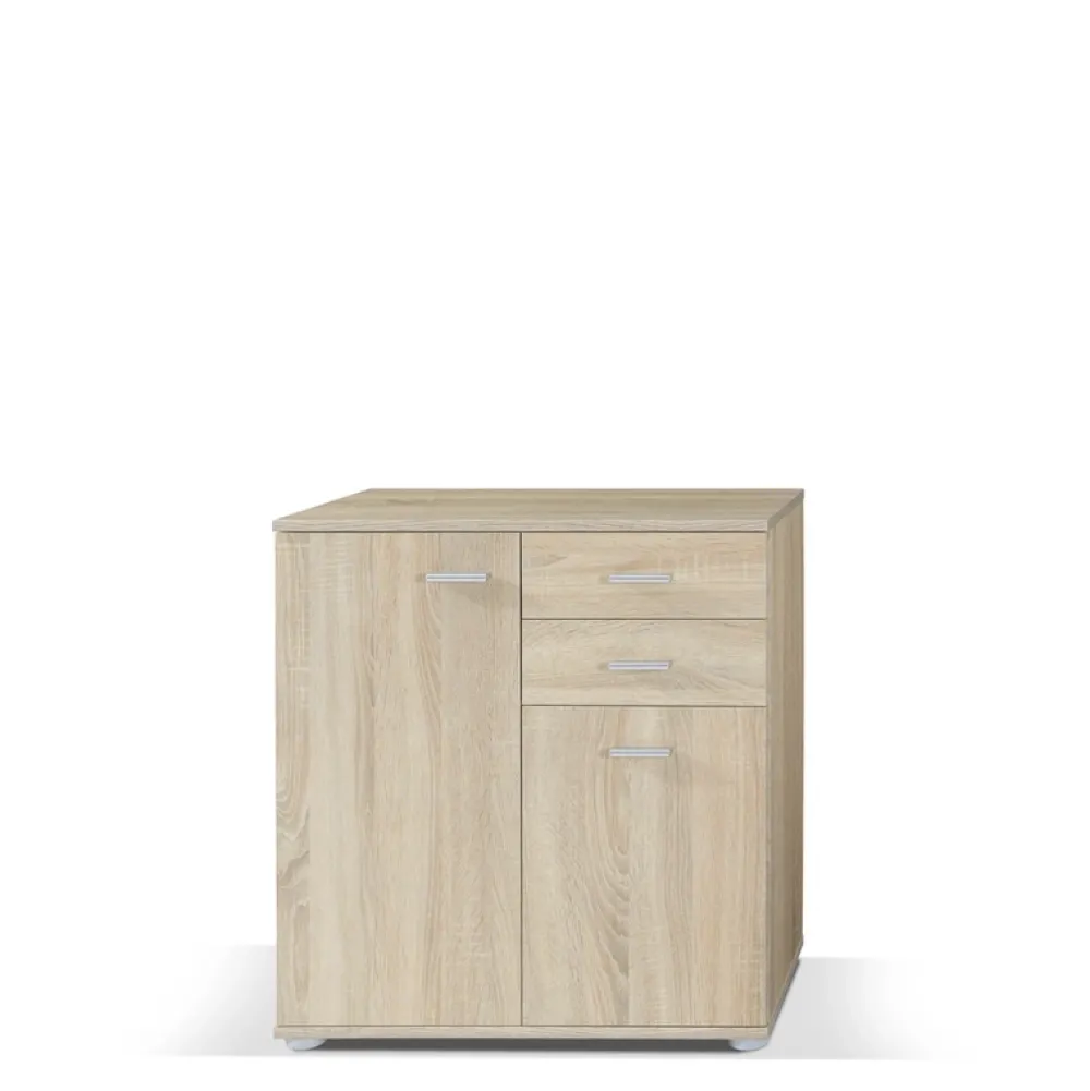 - Zapraszamy do świata klasycznego stylu z naszą komodą MANAUS o szerokości 71 cm. Wykonana w ciepłym odcieniu dębu sonoma, z dwoma drzwiami i dwiema szufladami, oferuje praktyczne miejsce do przechowywania.