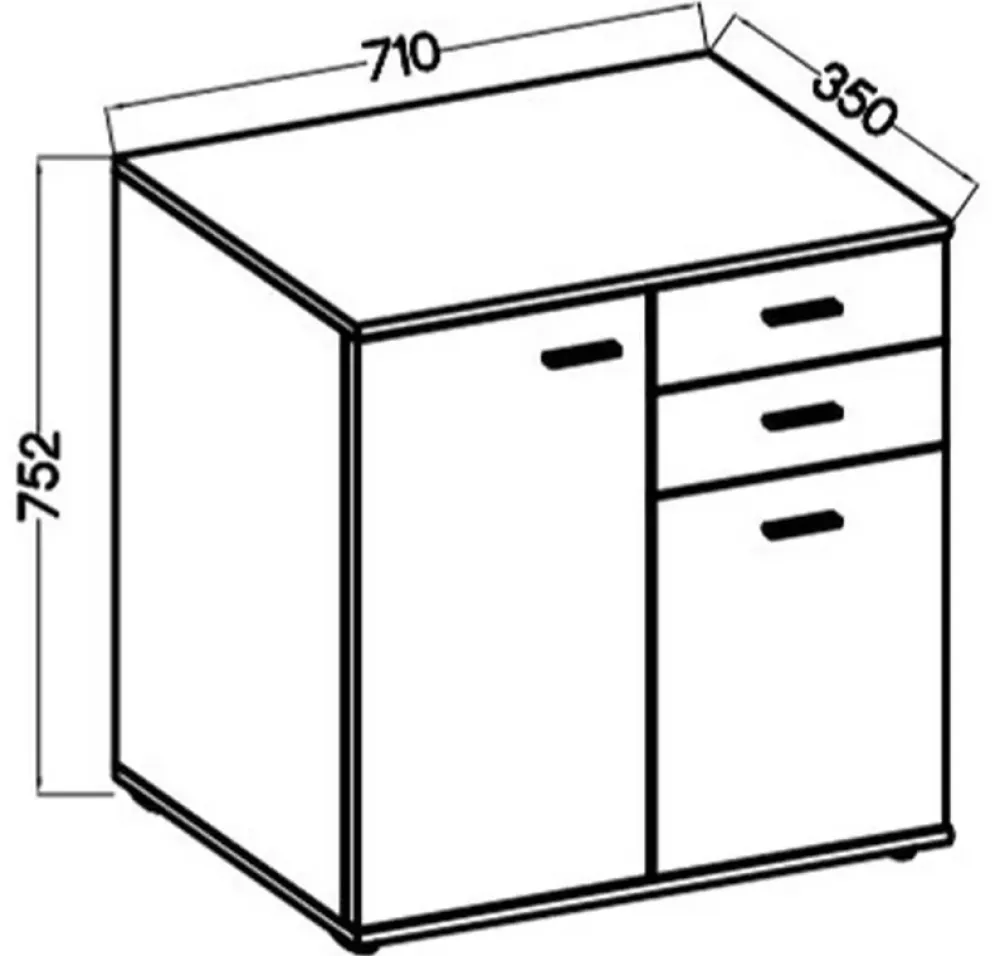 Komoda ma szerokość 71 cm, co czyni ją idealną do pomieszczeń o różnej wielkości. Po lewej stronie komody znajdują się duże drzwi, które ukrywają wewnątrz półkę, dzielącą przestrzeń na pół. To ułatwia segregację i przechowywanie różnych przedmiotów, od ubrań i bielizny po gry i pamiątki.