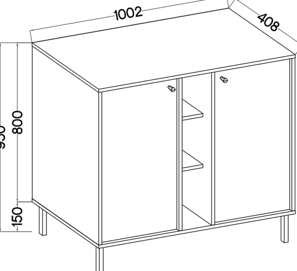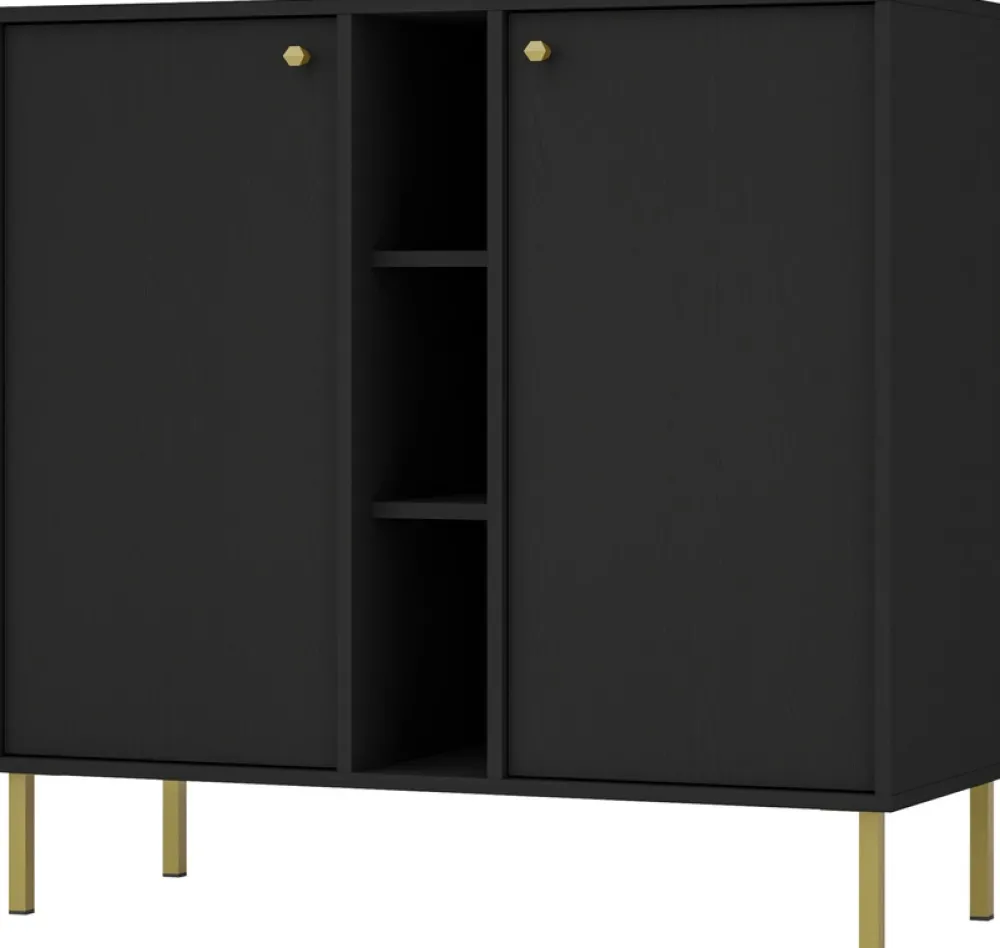 Komoda została zaprojektowana z myślą o maksymalnym wykorzystaniu przestrzeni. Składa się z dwojga drzwi, za którymi znajdują się pojemne półki, idealne do przechowywania wszelkiego rodzaju przedmiotów, od książek po dekoracje. Pomiędzy drzwiami znajduje się otwarta przegroda z dwiema półkami, która nie tylko dodaje uroku, ale także pozwala na wyeksponowanie ulubionych ozdób czy sprzętu RTV.