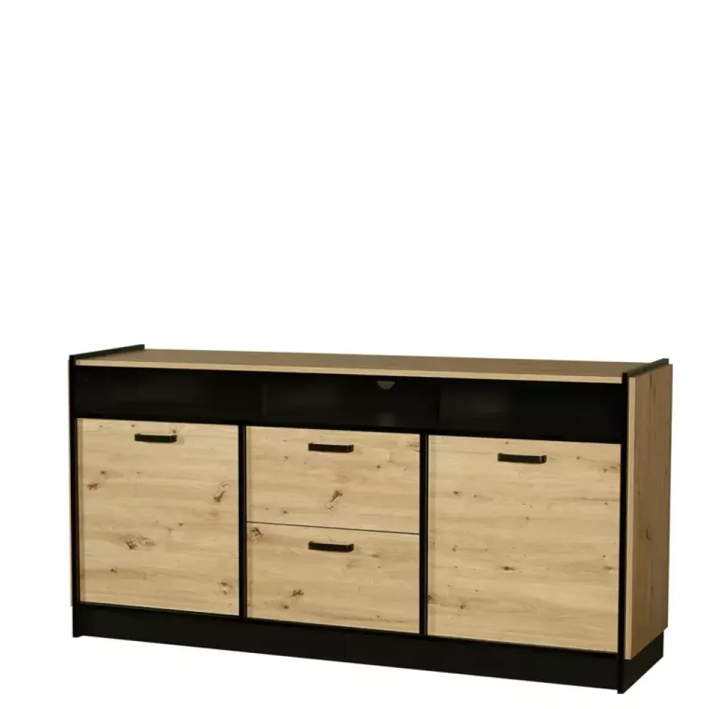 Komoda do salonu KALETTO to mebel, który łączy funkcjonalność z pięknym wyglądem. Z dwiema szufladami w centralnej części, zapewnia mnóstwo miejsca na przechowywanie różnych przedmiotów, takich jak bielizna stołowa, dokumenty lub ulubione filmy DVD. Dodatkowo, drzwi po lewej i prawej stronie komody prowadzą do półek, gdzie można umieścić książki, albumy z fotografiami lub inne dekoracje. Ponadto, estetyczny wygląd mebla jest wspaniałym dodatkiem do każdego salonu, ponieważ pasuje do wielu różnych stylów aranżacyjnych. Kolejną zaletą tej komody z szufladami jest jej uniwersalność. Można ją wykorzystać nie tylko w salonie, ale również w innych pomieszczeniach domu, takich jak sypialnia, gabinet czy jadalnia. Dzięki temu, że mebel ten oferuje różne opcje przechowywania, można go dostosować do własnych potrzeb i preferencji. Ostatnią, ale nie mniej ważną, zaletą tej komody jest łatwość w utrzymaniu jej w czystości. Dzięki prostemu kształtowi i gładkim powierzchniom, można ją szybko i łatwo wyczyścić za pomocą wilgotnej szmatki, bez potrzeby stosowania specjalistycznych środków czyszczących. Solidna konstrukcja, estetyczny wygląd, uniwersalność i łatwość w utrzymaniu czystości sprawiają, że jest to idealny wybór do każdego domu.