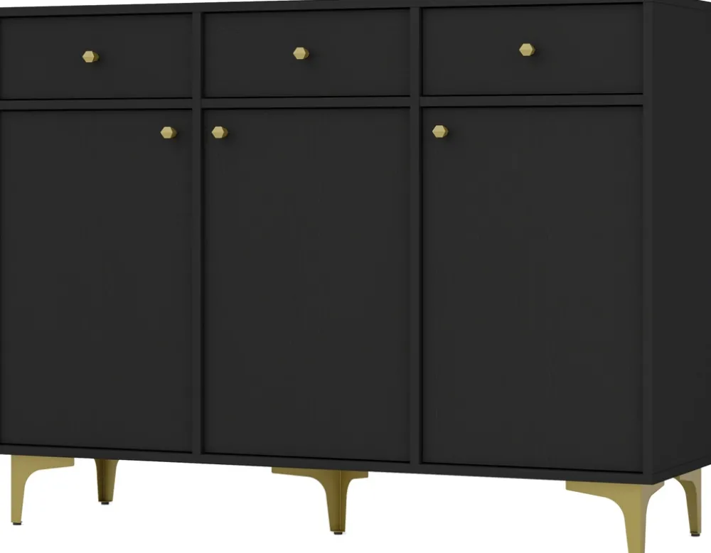 Pod szufladami znajdują się trzy drzwi, za którymi kryją się półki. Każda sekcja jest wyposażona w półkę, co pozwala na uporządkowane przechowywanie większych przedmiotów, takich jak książki, zastawa stołowa czy tekstylia. Dzięki temu z łatwością utrzymasz porządek w swoim salonie.