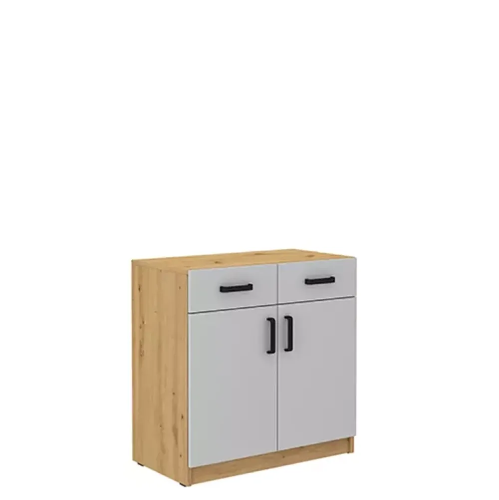 Komoda biurowa MULL ma 79,9 cm szerokości i wyposażono ją w dwie szuflady i cztery wnęki. Mała komoda sprawdzi się nie tylko w biurze, ale też w innych pomieszczeniach w stylu loftowym, czy nowoczesnym. Korpus w kolorze dąb artisan i jasno szare fronty – to jest właśnie wyraz nowoczesności.