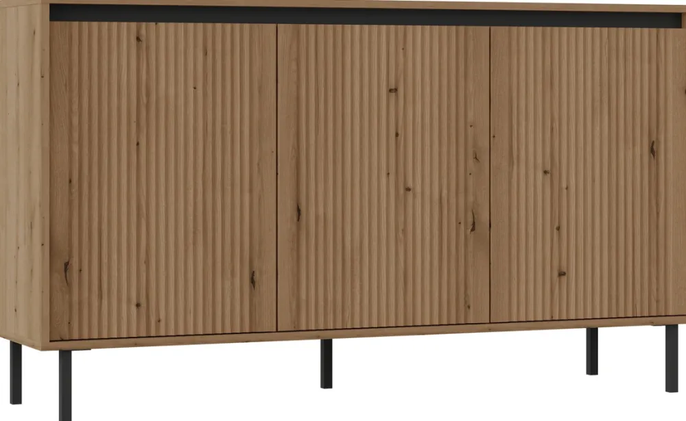 Trzy drzwi wykonane z płyty MDF z frezowanym wykończeniem dodają komodzie wyrafinowanego i ponadczasowego charakteru. Mechanizm cichego domyku zapewnia płynne i bezgłośne zamykanie, co podnosi komfort codziennego użytkowania.