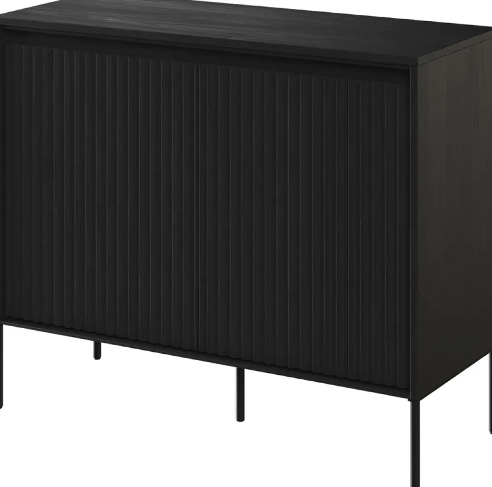 Frezowane fronty o prostym kształcie wykonane z płyty MDF o grubości 18 mm tworzą unikalny wzór półwałka, który nadaje meblowi wyrazistej, trójwymiarowej głębi. Ten subtelny, a jednocześnie zdecydowany design idealnie komponuje się z czarnym wykończeniem, tworząc niezapomniane wrażenie.