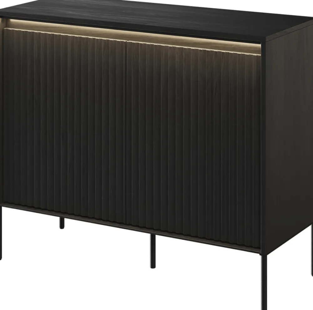 Oświetlenie LED klasy A++, zintegrowane z komodą, tworzy zachwycające, nastrojowe podświetlenie, które pięknie podkreśla czarny kolor komody. Te energooszczędne światła są nie tylko estetycznym dodatkiem, ale również praktycznym, ekologicznym rozwiązaniem.