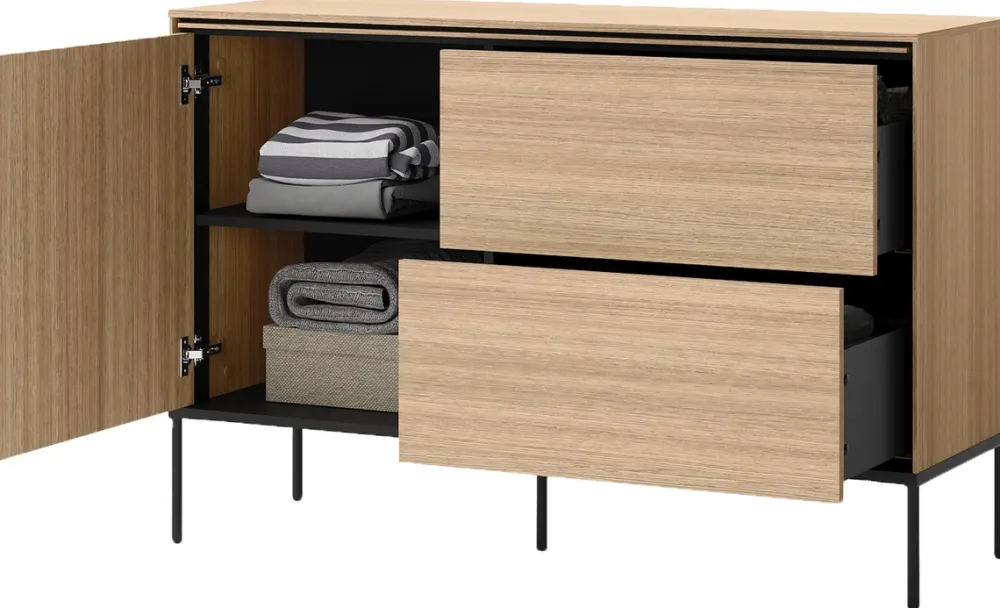 - Komoda do salonu 127 cm VISSO posiada drzwi po lewej stronie, za którymi znajdują się dwie półki. Po prawej stronie komody swoje miejsce znalazły dwie pojemne szuflady osadzone na prowadnicach kulkowych. Czarne nóżki wykonano z metalu.
