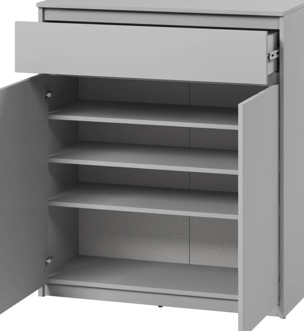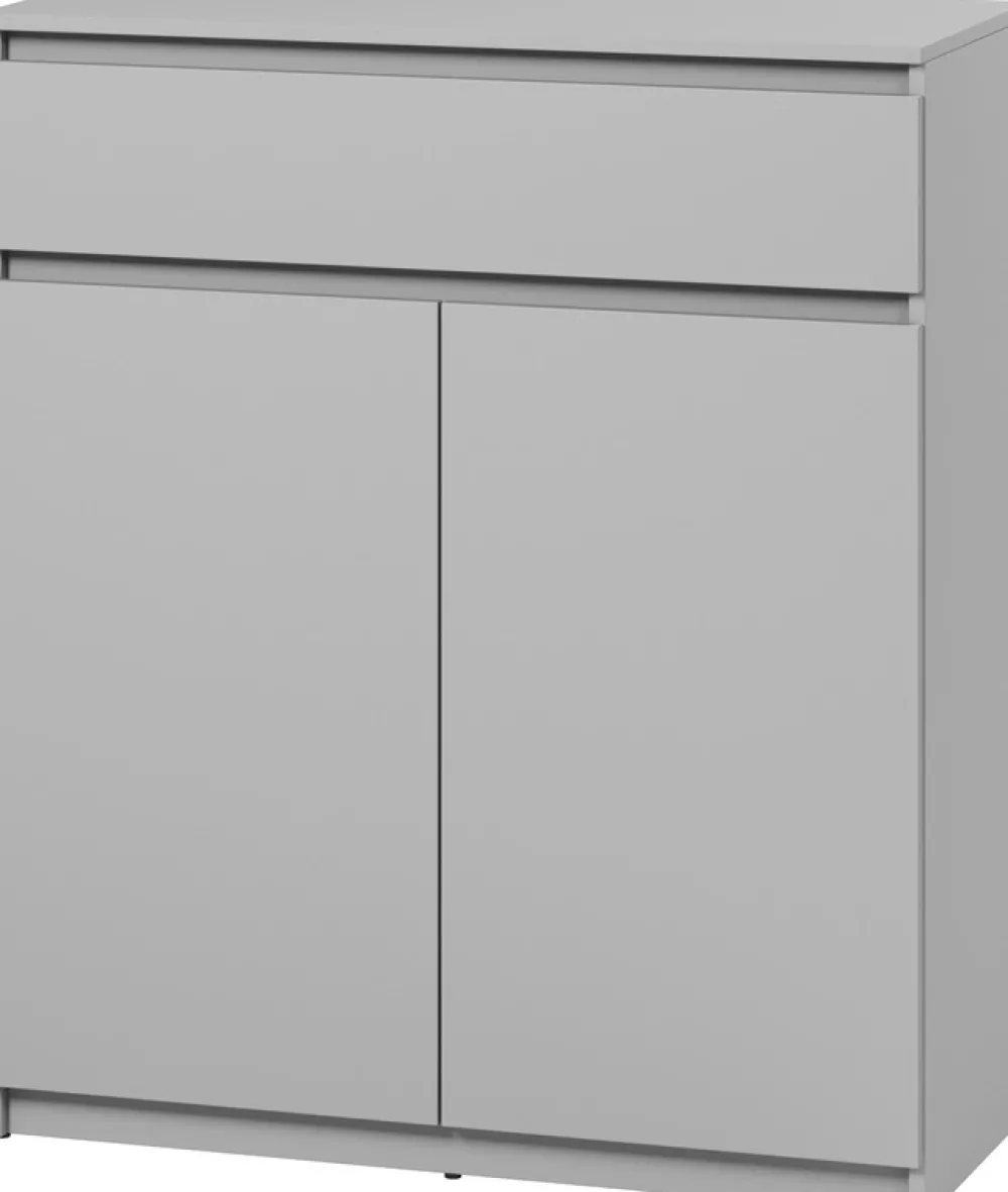 - Nowoczesna dwudrzwiowa komoda SIMPLY w szarym kolorze to funkcjonalny mebel do garderoby. Posiada szafkę z półkami oraz szufladę, oferując praktyczną przestrzeń do przechowywania. Idealna do przedpokoju, salonu, sypialni lub garderoby.