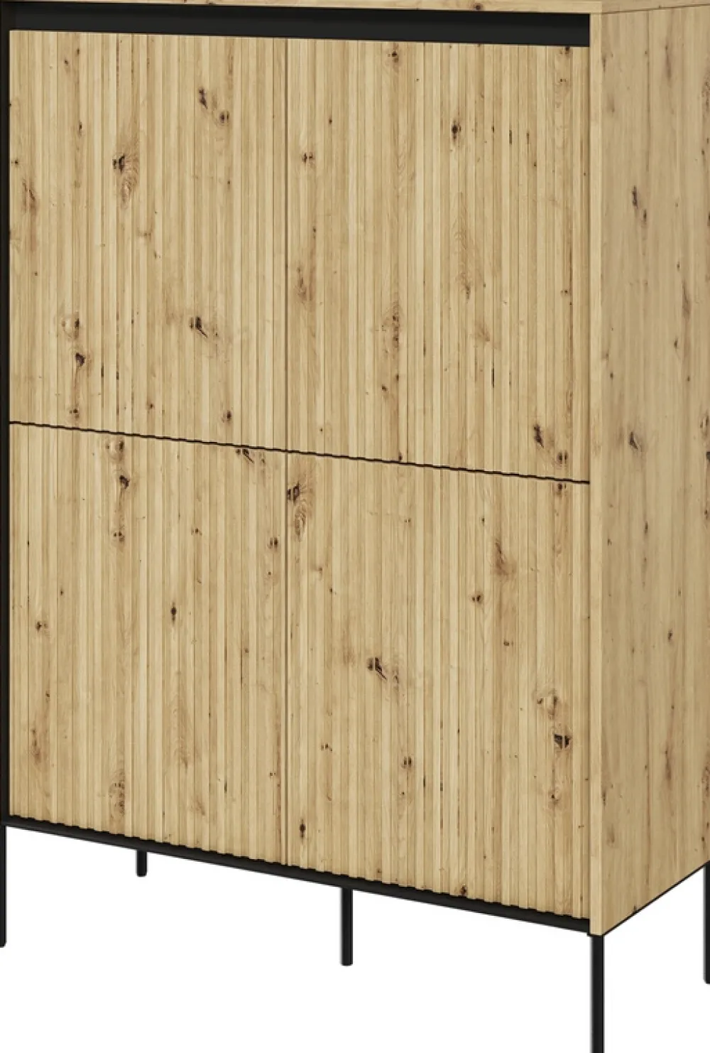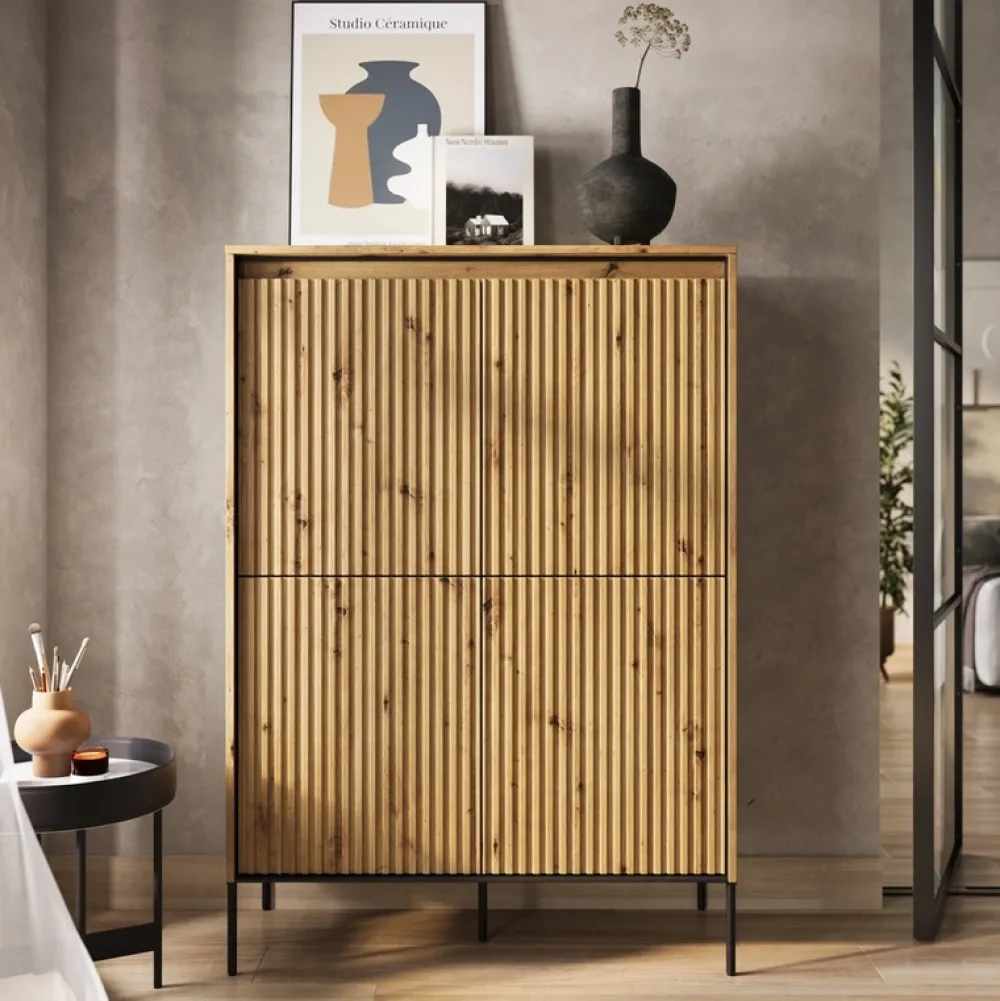 Odkryj wyrafinowaną elegancję z naszą czterodrzwiową komodą TREND w kolorze dąb artisan. Frezowane fronty, wykonane z precyzją i dbałością o najdrobniejsze szczegóły, w subtelnym prostym wzorze dodają meblowi unikalnej, głębi, wprowadzając do Twojego wnętrza nutę naturalnej elegancji.