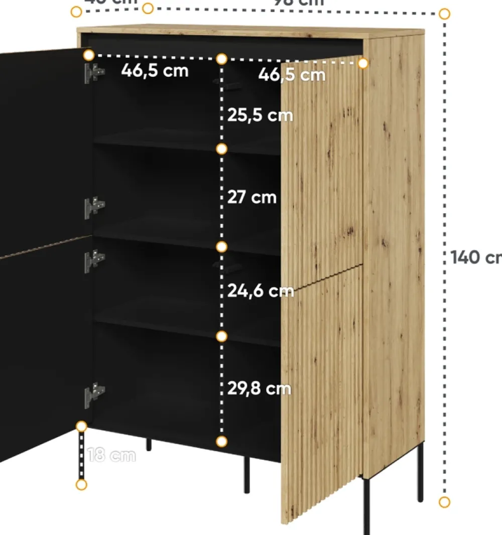 Komoda o szerokości 98 cm to idealna propozycja zarówno do przestronnych salonów, jak i mniejszych pomieszczeń. Jej wysokie, metalowe nóżki to nie tylko solidna podstawa, ale również wyrafinowany detal, który dodaje meblowi nowoczesnej, minimalistycznej estetyki.