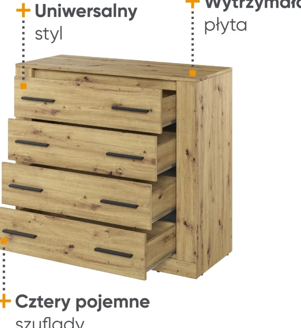 Komoda ta wyposażona jest w cztery głębokie szuflady, które poruszają się płynnie i bez wysiłku dzięki zastosowaniu nowoczesnych prowadnic rolkowych. Dzięki temu dostęp do zawartości jest łatwy i intuicyjny, co czyni ją niezwykle praktycznym meblem w codziennym użytkowaniu.