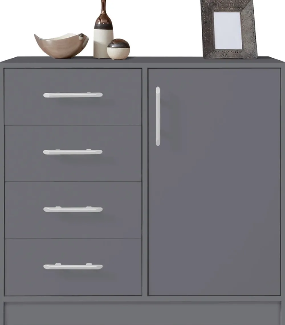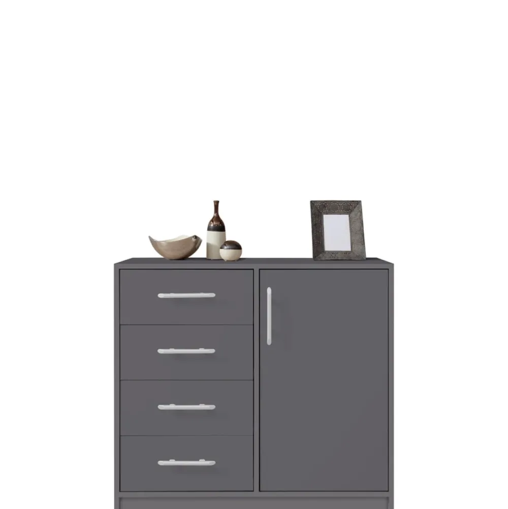 - Komoda SEVAS została wyposażona w cztery szuflady umieszczone po lewej stronie oraz drzwi, za którymi znajduje się półka po prawej stronie. Komoda dzięki nowoczesnej stylistyce doskonale wpisuje się we współczesne aranżacje pomieszczeń.