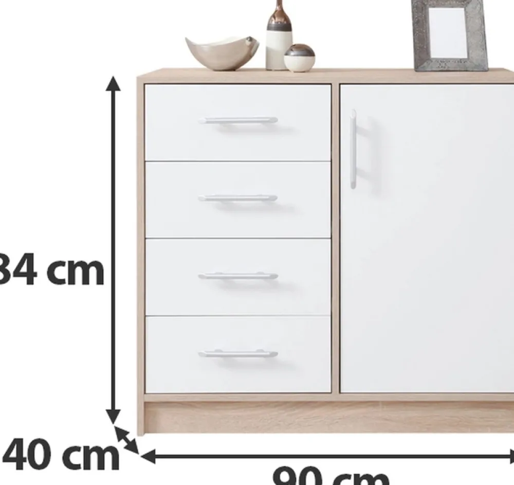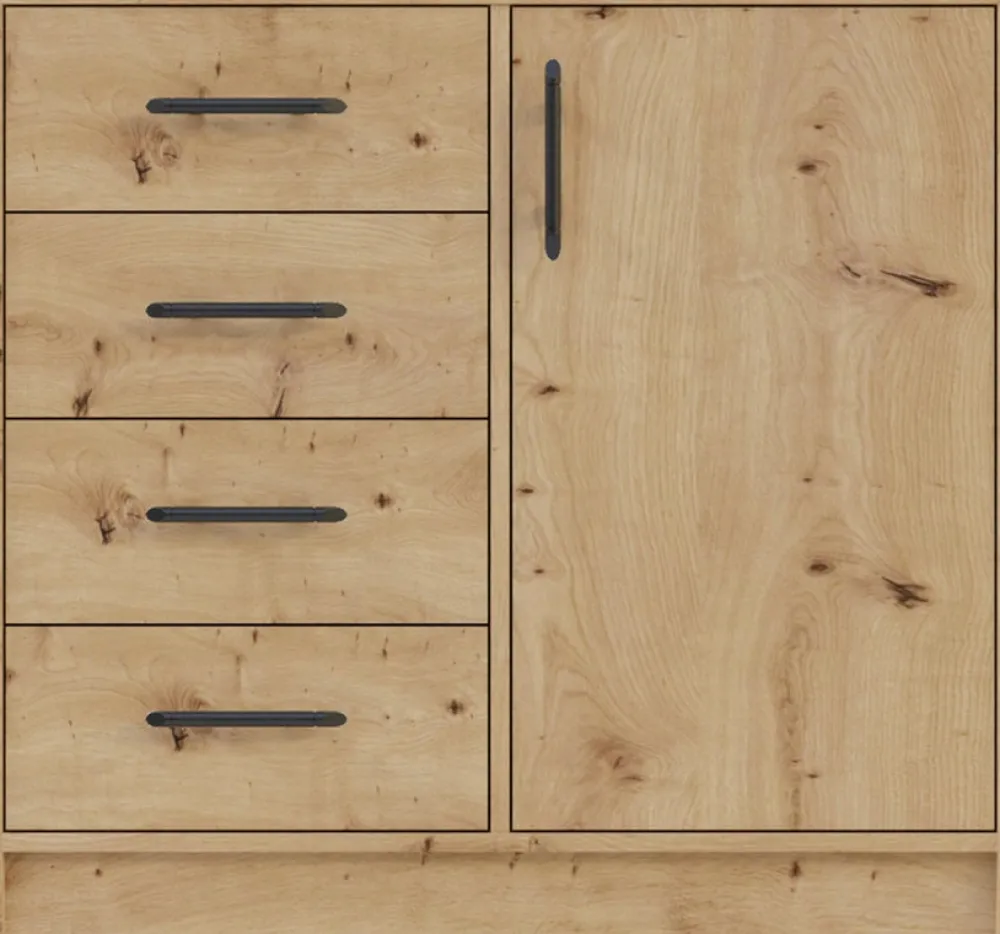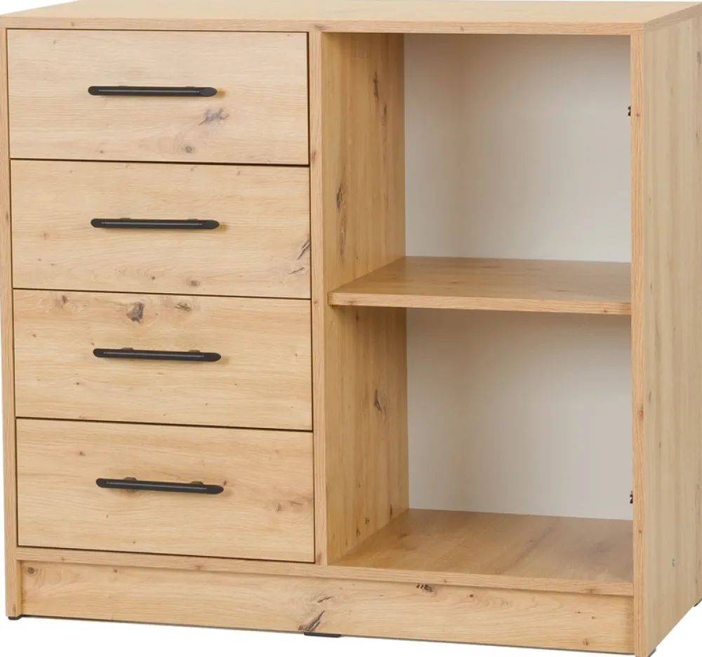 - Komoda SEVAS dąb artisan 90 cm – z 4 szufladami i szafką z półką. Ciepły kolor drewna wprowadza przytulność, a funkcjonalny układ zapewnia porządek. Idealna do salonu, sypialni lub przedpokoju. Styl, trwałość i praktyczne przechowywanie.
