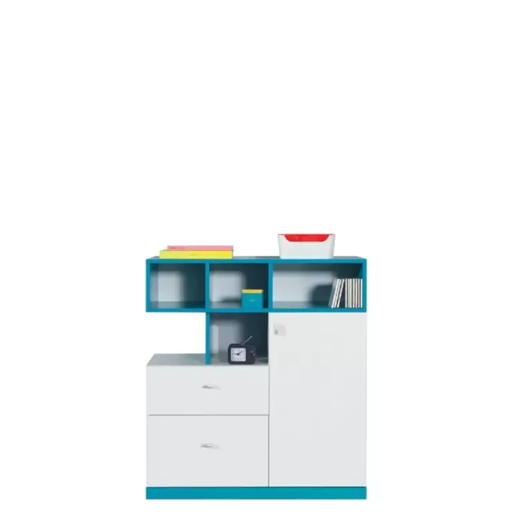 - Komoda z kolekcji MALVES posiada dwie pojemne szuflady oraz szafkę w której znajduje się półka, dzięki której możesz zachować porządek w umieszczonych ubraniach wewnątrz. Dodatkowo komoda posiada półki na twoje dekory u góry.