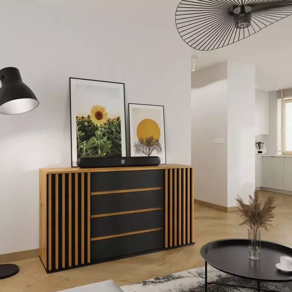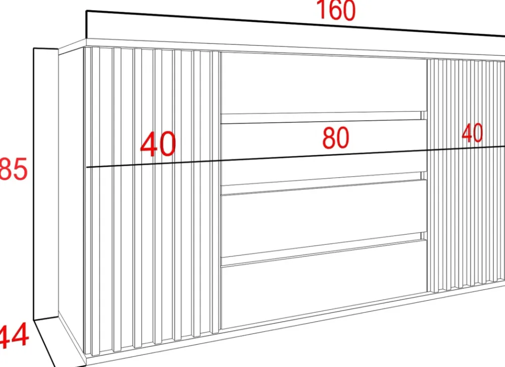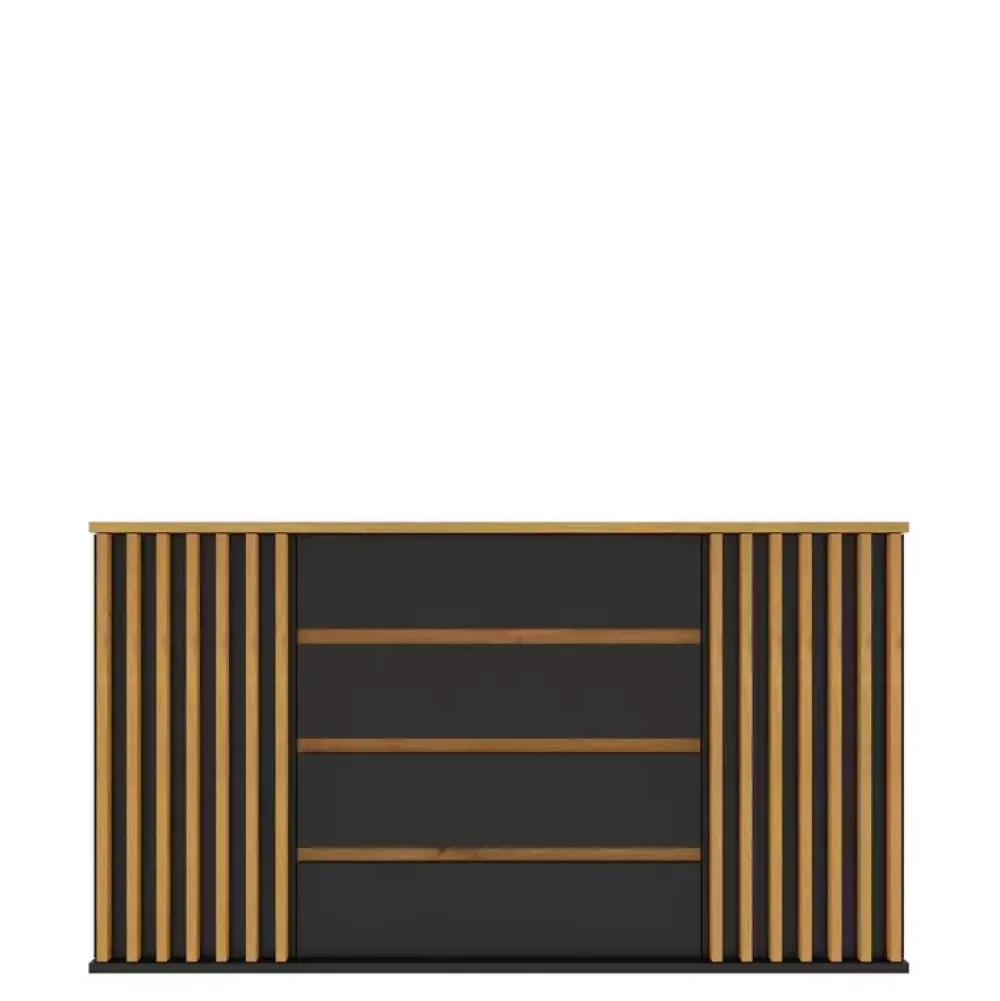 Komoda NELGARI posiada 160 cm szerokości, a w nich znajdujące się cztery szuflady umieszczone na prowadnicach kulkowych, w których możesz umieścić rozmaite akcesoria oraz cześć własnej garderoby. Dodatkowo komoda posiada drzwi z lamelami po lewej i prawej stronie, gdzie za każdymi z nich znajduje się jedna półka.