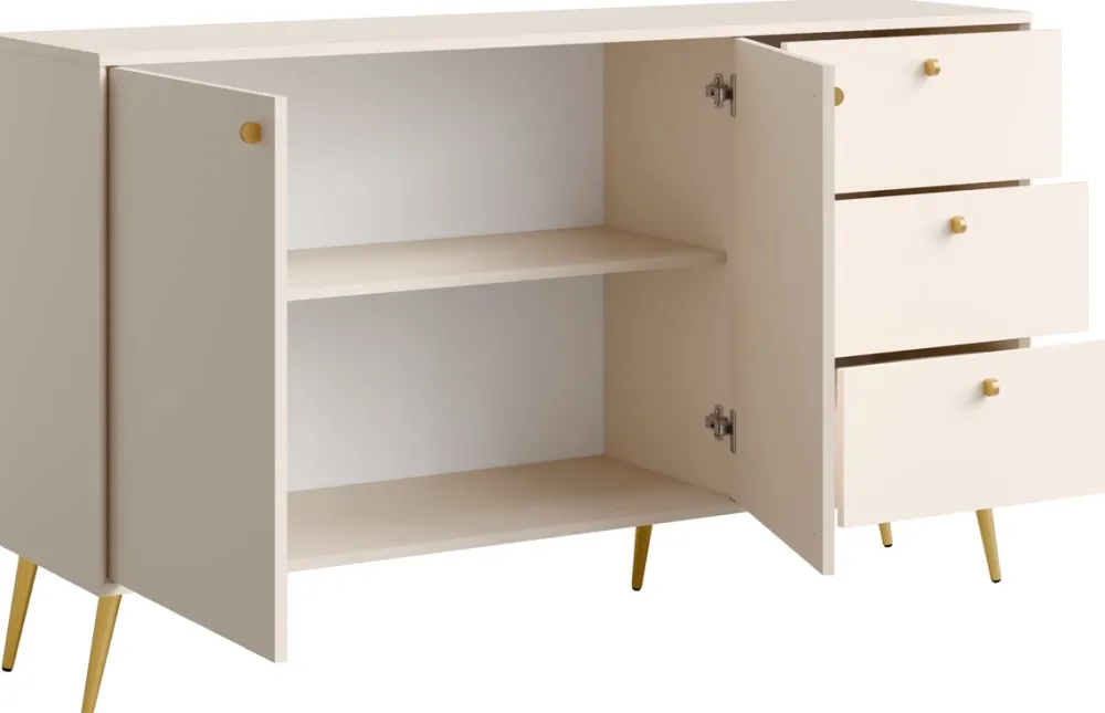 - Komoda ROSEA 156 cm w kolorze beż piaskowy to elegancki mebel do salonu z 2 drzwiami i 3 szufladami. Złote uchwyty i nóżki podkreślają nowoczesny charakter, a pojemne półki i szuflady gwarantują wygodne przechowywanie. Idealna do wnętrz glamour i classic.