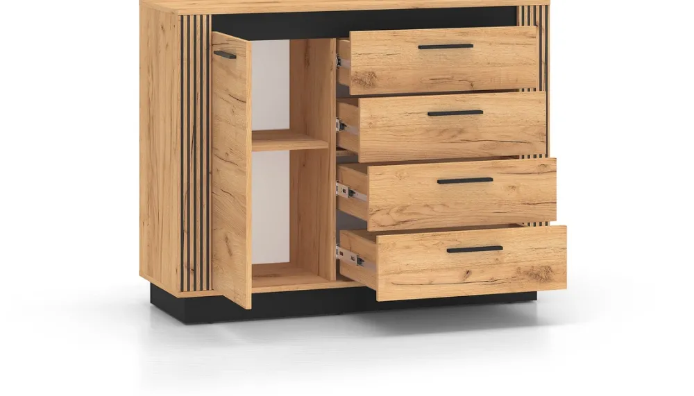Kompaktowa komoda o szerokości 115 cm to idealne połączenie funkcjonalności i nowoczesnego designu. Jej harmonijna kolorystyka – ciepły dąb craft złoty i głęboka czerń – sprawdzi się zarówno w salonie, sypialni, jak i domowym biurze. Mebel oferuje aż cztery pojemne szuflady oraz jedną szafkę z półką, zapewniając mnóstwo miejsca na ubrania, dokumenty lub inne drobiazgi.