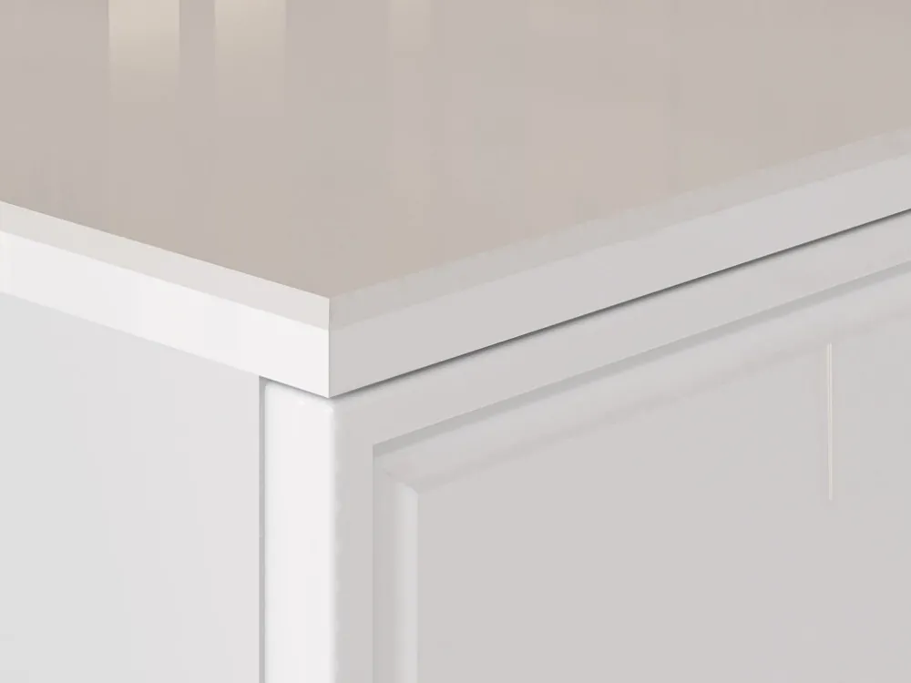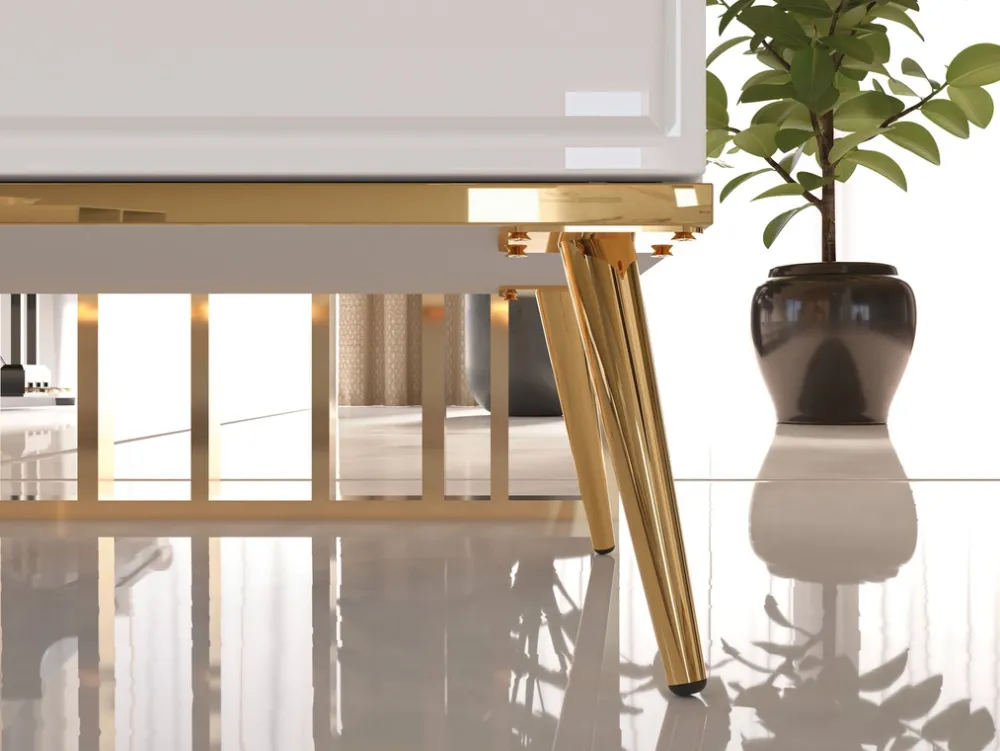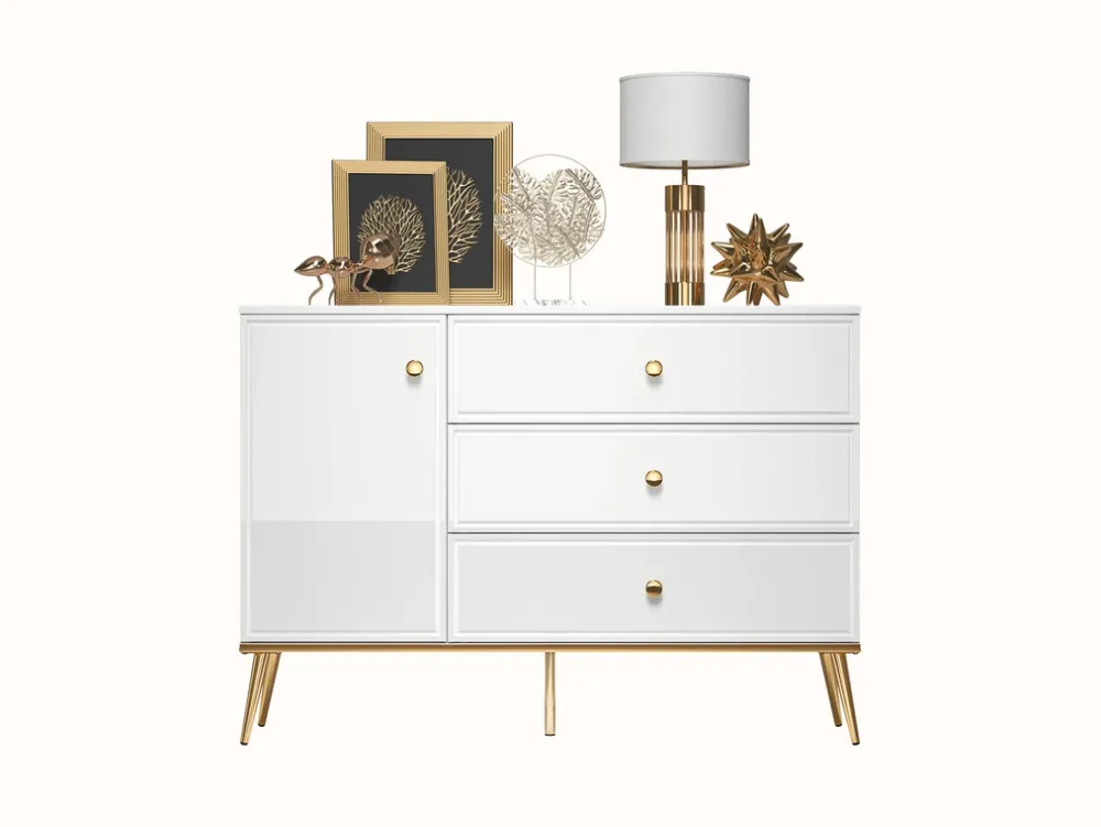 Całość komody jest utrzymana w harmonijnej bieli – korpus w klasycznym białym kolorze, natomiast fronty w olśniewającym białym połysku, który dodaje wnętrzu nowoczesnego blasku. Metalowe uchwyty i nogi w kolorze złotym stanowią subtelny, lecz efektowny akcent, który dodaje meblowi luksusowego charakteru.