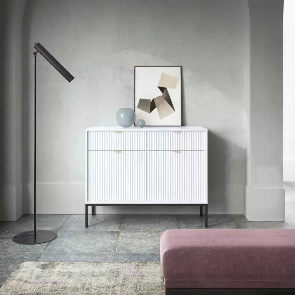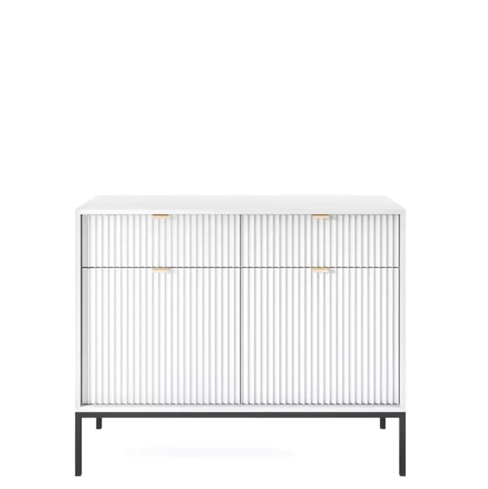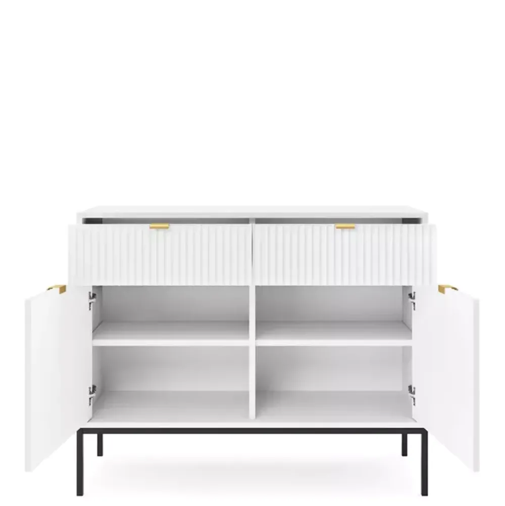 Biała komoda AVANTI o szerokości 104 cm posiada dwie szuflady i cztery niezależne wnęki, w których znajdziesz dużo miejsca do przechowywania. Ryflowane fronty z pewnością przyciągną oko odwiedzających Twój dom gości, a złote uchwyty zapewnią Ci wygodny dostęp do wnętrza komody. Konstrukcję osadzono na metalowych nóżkach malowanych proszkowo na czarno. Taka podpora zapewni stabilność mebla.