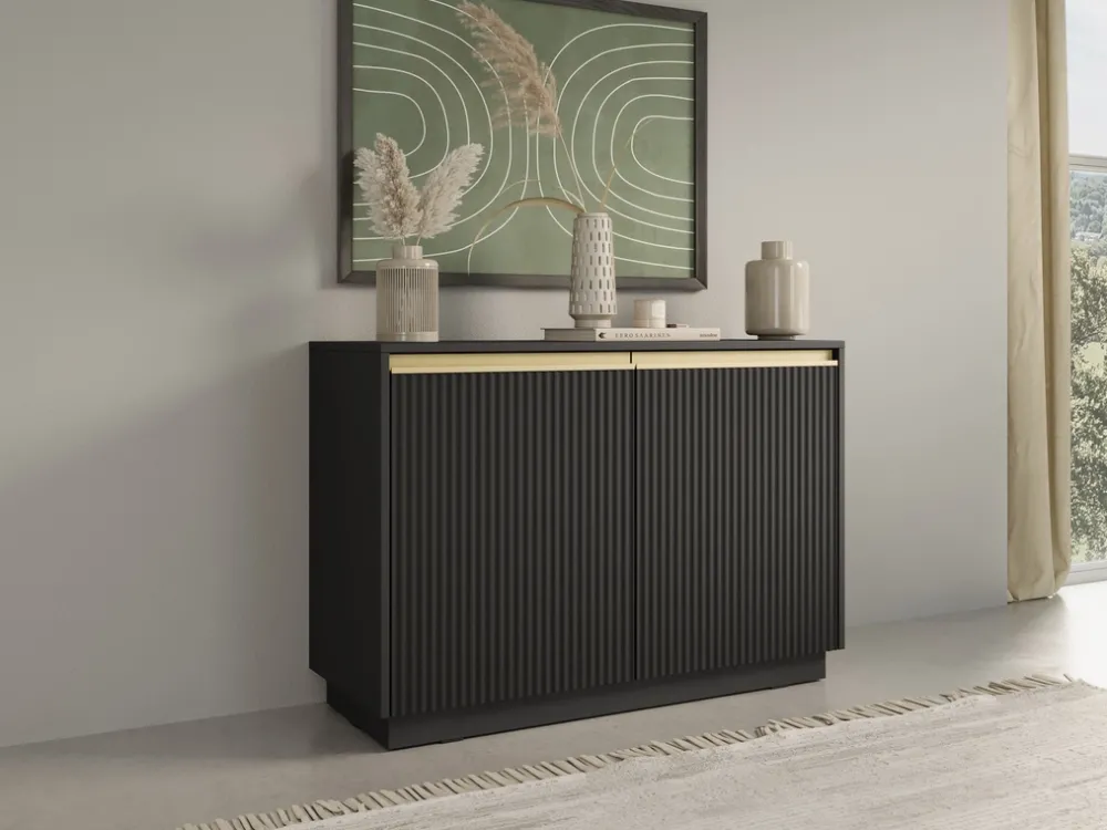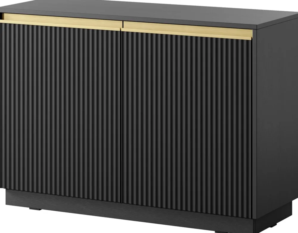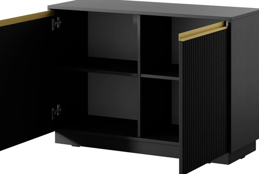 - Komoda 103 cm RAVO posiada dwoje drzwi z ryflowanymi frontami, które zostały wykonane z płyty MDF o grubości 18 mm. Drzwi posiadają metalowe zawiasy wzbogacone o mechanizm cichego domyku. Uchwyty wykonane ze szczotkowanego aluminium.