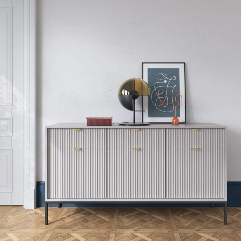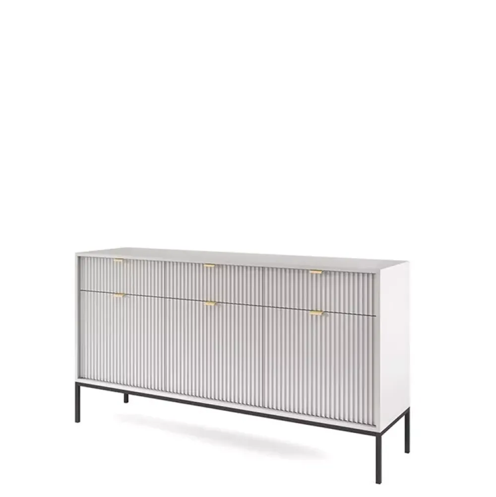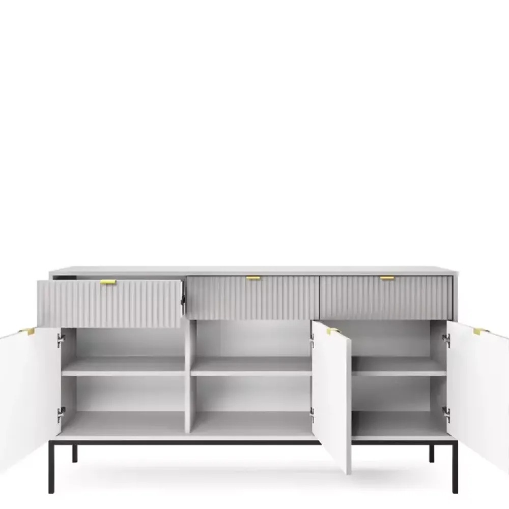 Szara komoda AVANTI o szerokości 154 cm posiada trzy szuflady i sześć niezależnych wnęk, w których znajdziesz dużo miejsca do przechowywania. Ryflowane fronty z pewnością przyciągną oko odwiedzających Twój dom gości, a złote uchwyty zapewnią Ci wygodny dostęp do wnętrza komody. Konstrukcję osadzono na metalowych nóżkach malowanych proszkowo na czarno. Taka podpora zapewni stabilność mebla.