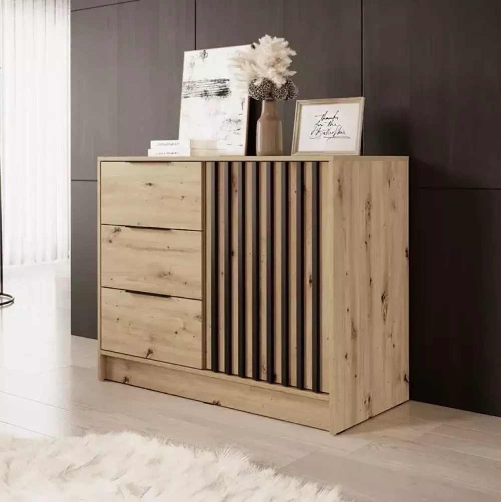 Komoda z lamelami z kolekcji KELLY wpasuje się w nowoczesne aranżacje, gdzie nie dość, że będzie ozdobą wnętrza, zapewni dużo miejsca do przechowywania. Komoda ma 105 cm szerokości i podzielono ją na dwie części. Po lewej stronie znajdują się trzy pojemne szuflady, a po prawej stronie jedna półka, która daje dwie wnęki do przechowywania. Czarne lamele nadają tej nowoczesnej komodzie ponadczasowego charakteru.