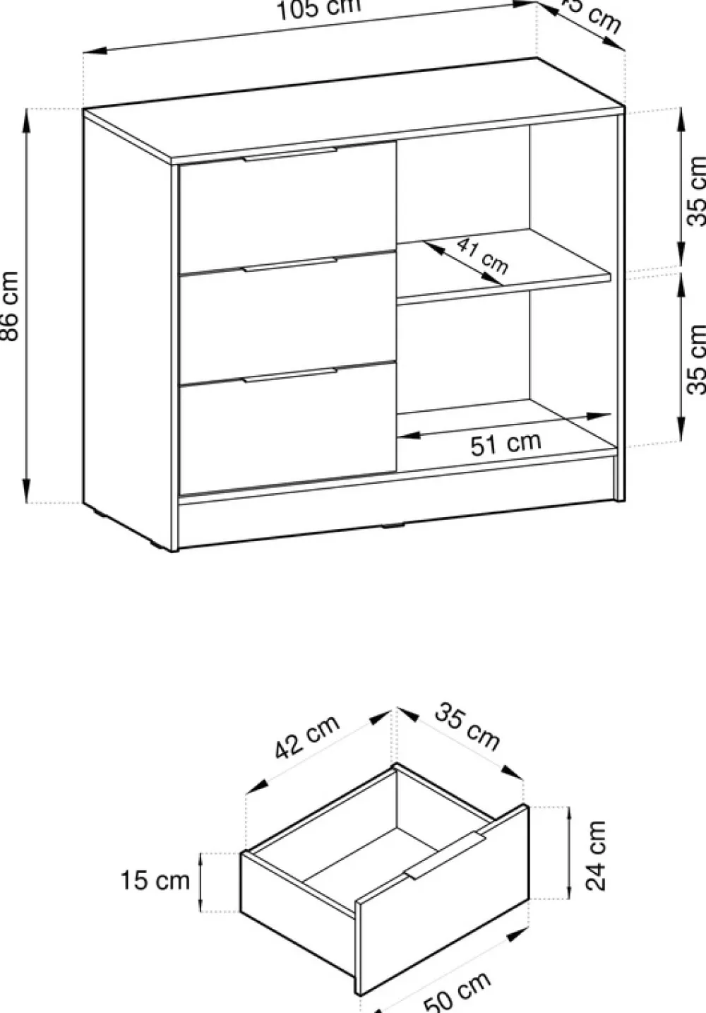 - Nowoczesna komoda z szufladami i półką ma 105 cm szerokości i sprawdzi się w salonie lub jako komoda do sypialni. Uroku nadają jej czarne lamele umieszczone na drzwiach uchylnych.