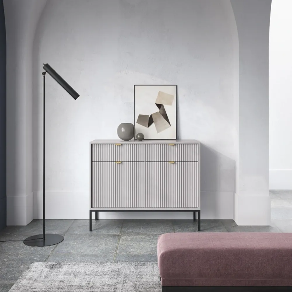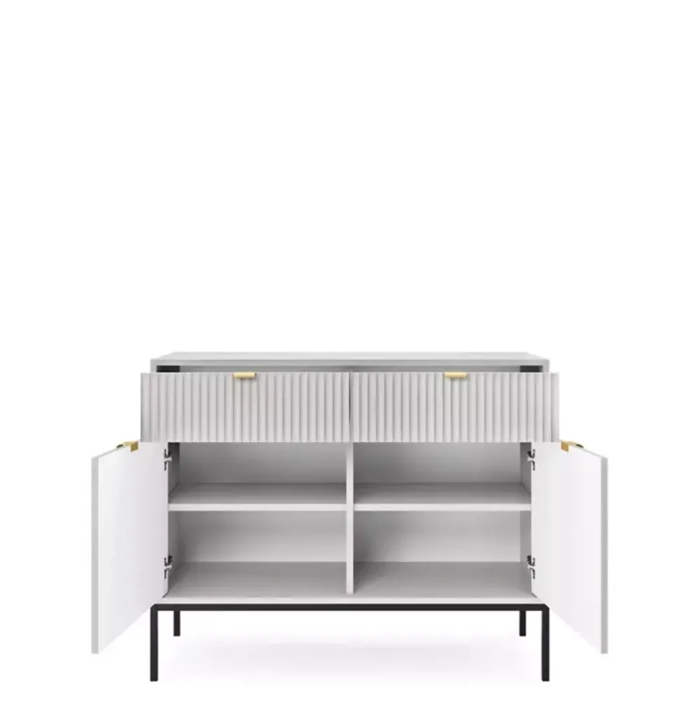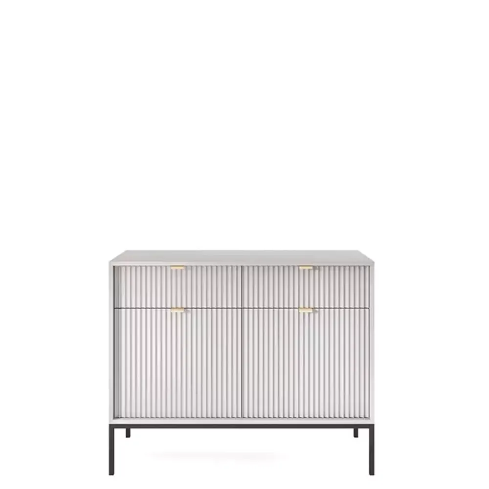 Szara komoda AVANTI o szerokości 104 cm posiada dwie szuflady i cztery niezależne wnęki, w których znajdziesz dużo miejsca do przechowywania. Ryflowane fronty z pewnością przyciągną oko odwiedzających Twój dom gości, a złote uchwyty zapewnią Ci wygodny dostęp do wnętrza komody. Konstrukcję osadzono na metalowych nóżkach malowanych proszkowo na czarno. Taka podpora zapewni stabilność mebla.