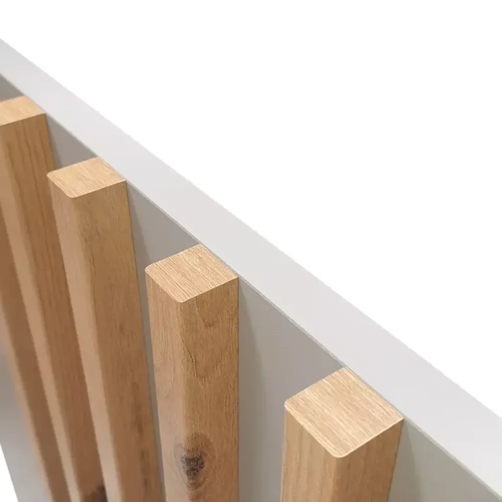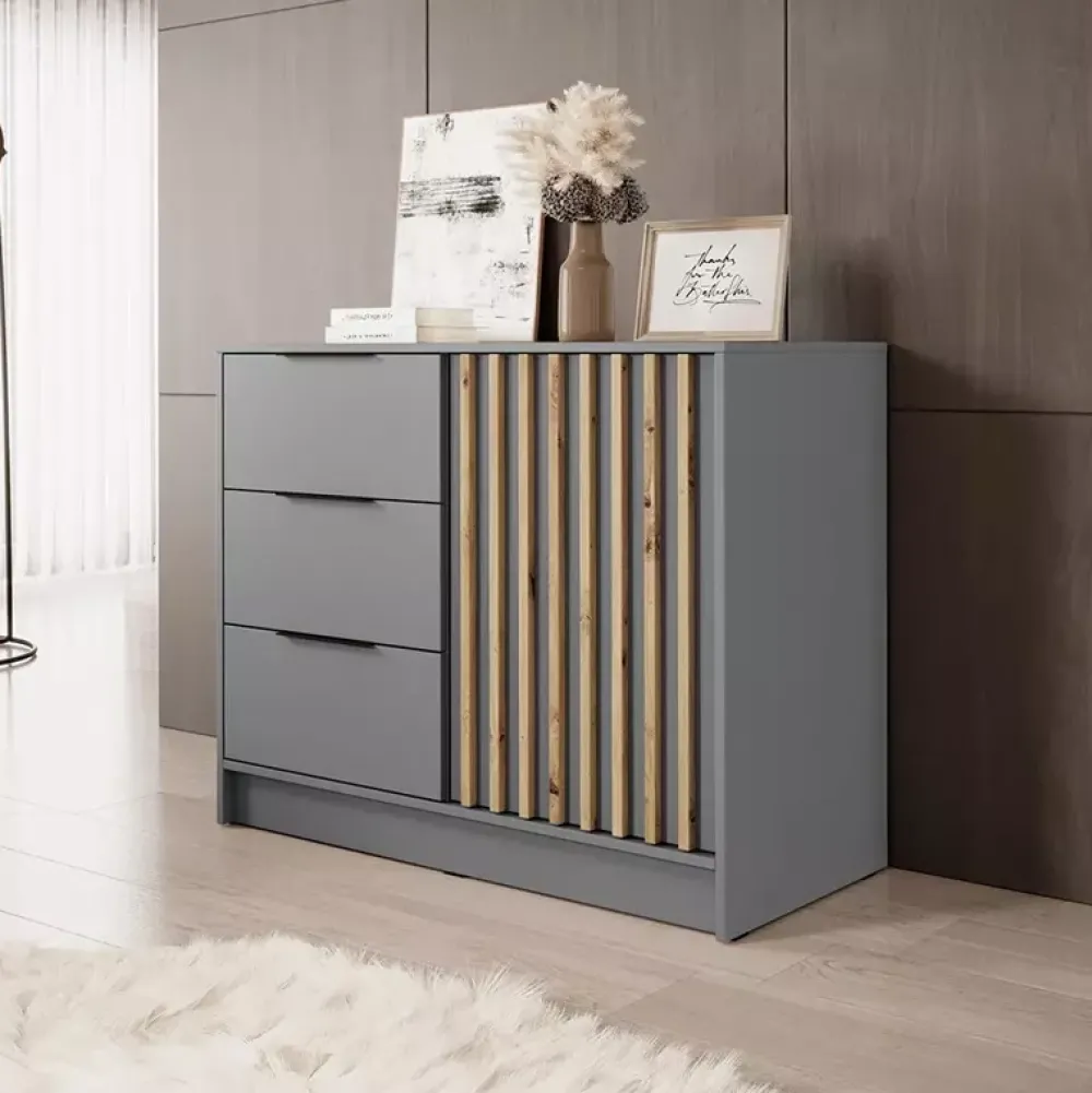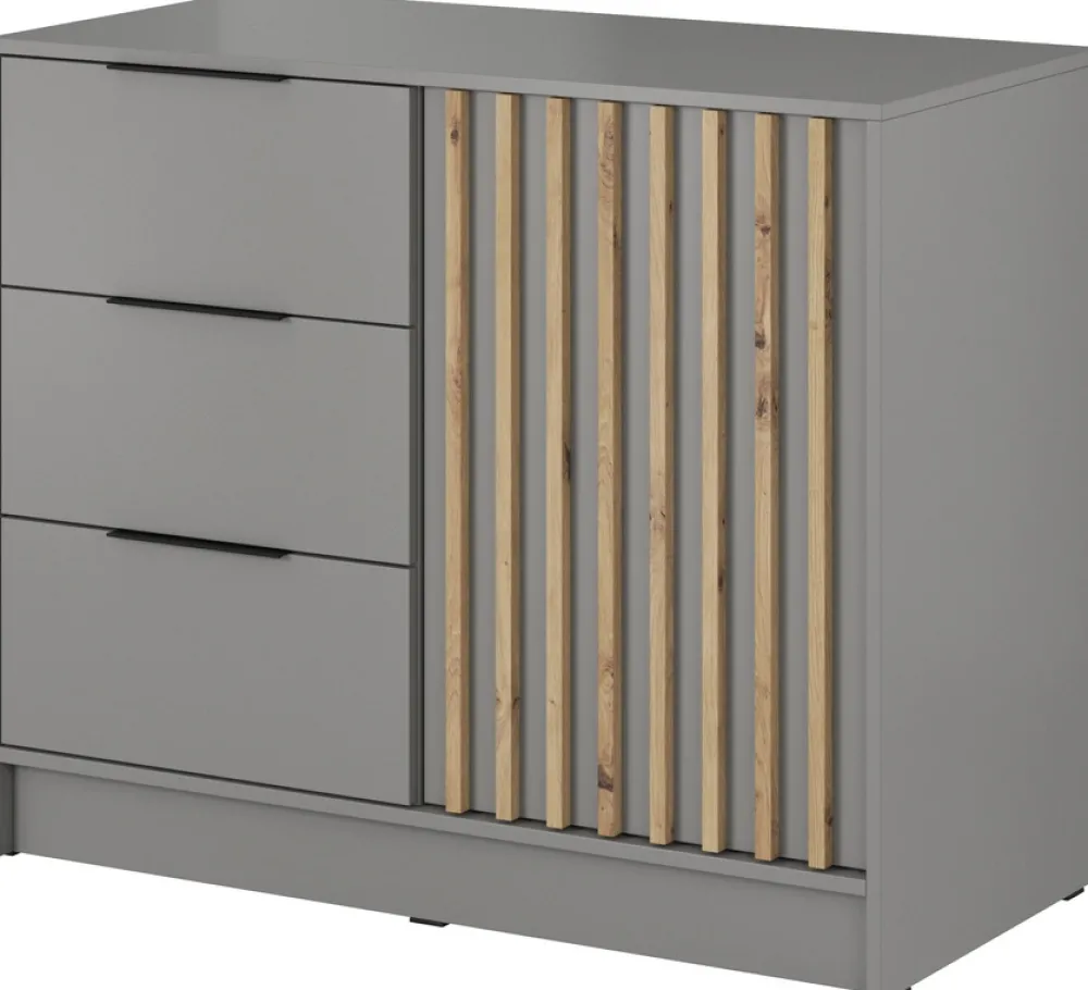 Komoda z lamelami z kolekcji KELLY wpasuje się w nowoczesne aranżacje, gdzie nie dość, że będzie ozdobą wnętrza, zapewni dużo miejsca do przechowywania. Komoda ma 105 cm szerokości i podzielono ją na dwie części. Po lewej stronie znajdują się trzy pojemne szuflady, a po prawej stronie jedna półka, która daje dwie wnęki do przechowywania. Szara płyta w połączeniu z lamelami w kolorze dąb artisan nadają tej nowoczesnej komodzie ponadczasowego charakteru.