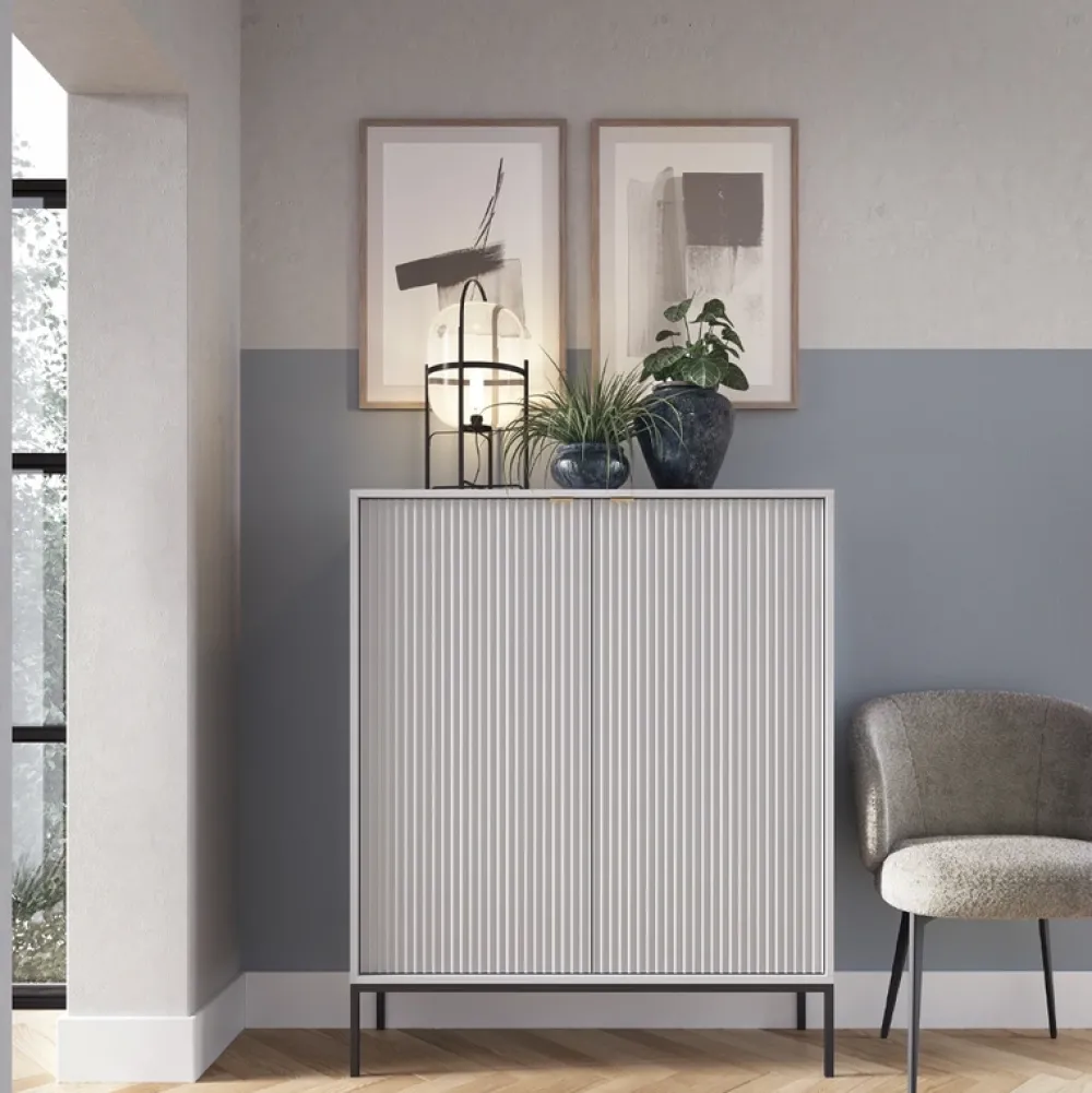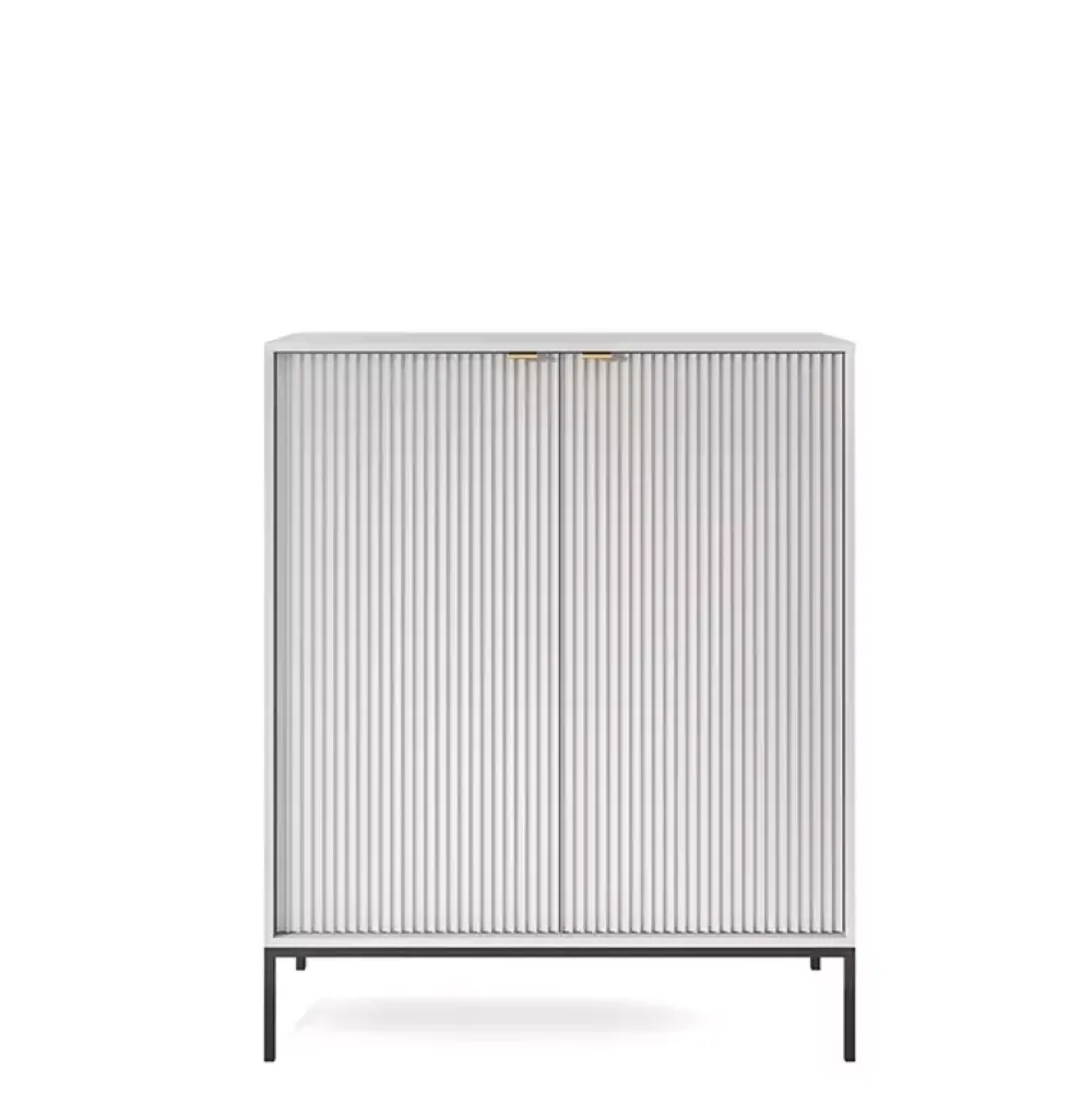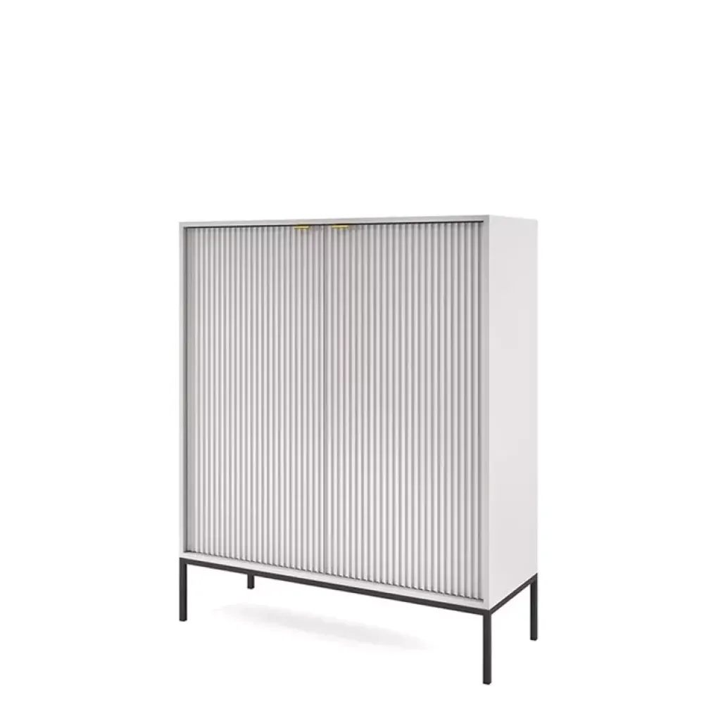 Pojemna komoda AVANTI wyposażona jest w cztery półki wykonane z płyty laminowanej. Wysoka komoda wsparta na metalowych nogach odnajdzie się w salonie urządzanym w stylu glamour, ale również w nowoczesnej aranżacji. Ryflowane fronty, które w niej zastosowano, są ozdobą same w sobie, a dodatkowo znajdują się na nich przepiękne złote uchwyty, za pomocą których wygodnie dostaniesz się do wnętrza mebla. Komodę wyposażono w zawiasy z cichym domykiem, więc nie musisz obawiać się, że obudzisz domowników, gdy podczas ich popołudniowej drzemki będziesz potrzebował czegoś z jej wnętrza. Zarówno po prawej, jak i po lewej stronie znajdują się dwie półki, więc łącznie masz sześć wnęk o głębokości 39 cm do wykorzystania. W takiej komodzie bez problemu zmieścisz segregatory, więc może być to komoda do biura.